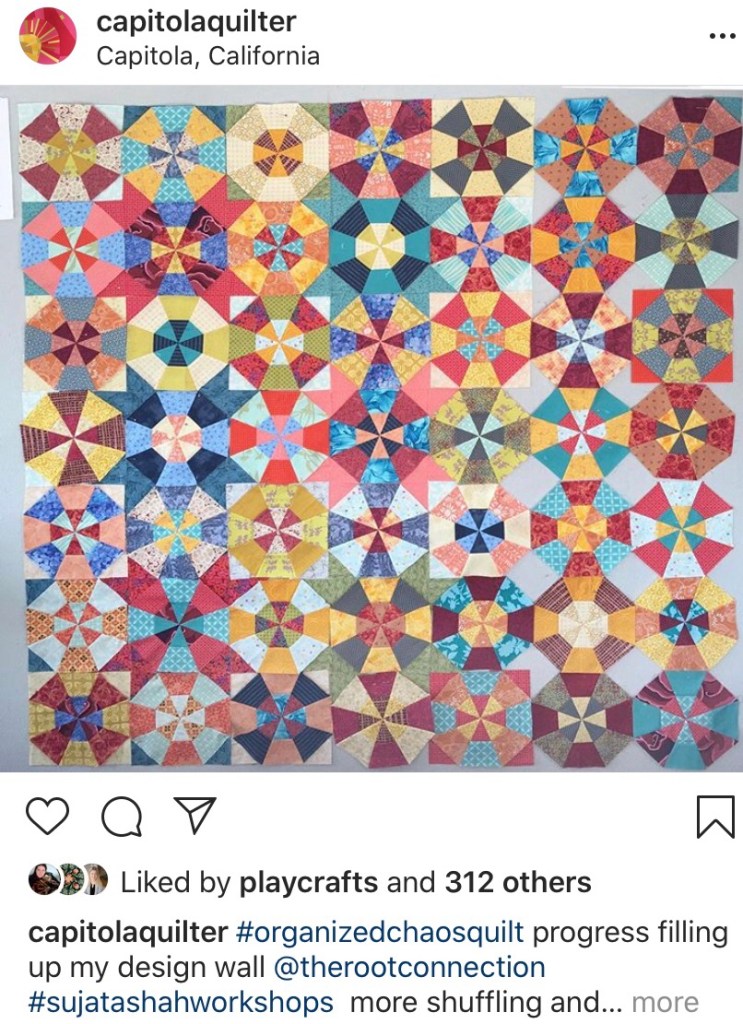 Apparently Sajata holds a workshop where some of the modern quilters that I like (see on Instagram #beesewcial) gather. Capitola quilter (see her work on Instagram) attended a gathering where participants worked on Sajata’s version of a Kaladiscope quilt called “Organized Chaos” (Instagram hashtag #organizedchaosquilt).