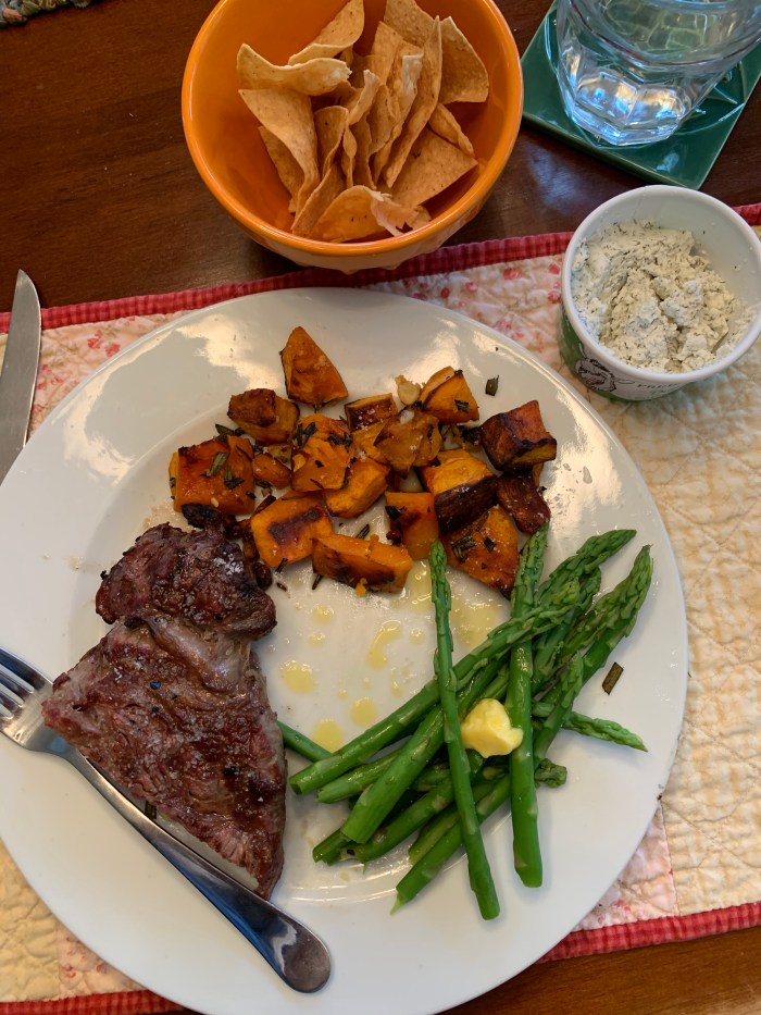 I’ve been trying to eat my big meal at noon these days as we move into winter. I grilled a steak to go with the squash, which I very nearly overcooked. That happens when one is whirling around doing multiple tasks. I added a few chips and goat cheese with dill to this meal.
