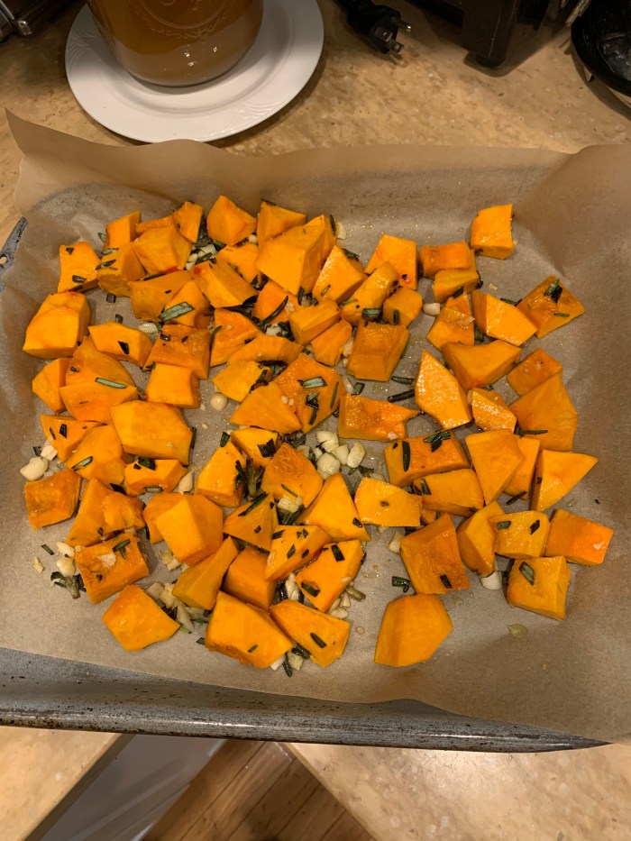 I cut up my Sunshine squash yesterday, but was not hungry at dinner as I had a big lunch. I had marinated it in good olive oil, fresh rosemary, and lots of garlic. Here’s what this squash looks like whole: it is the orange one in front. This squash is heavier and mealier than say, a butternut squash. But, when roasted, acquires the same sweet, caramelized tastiness.