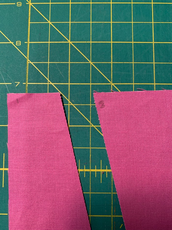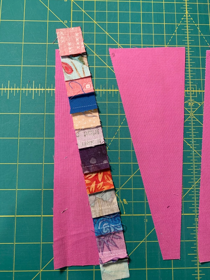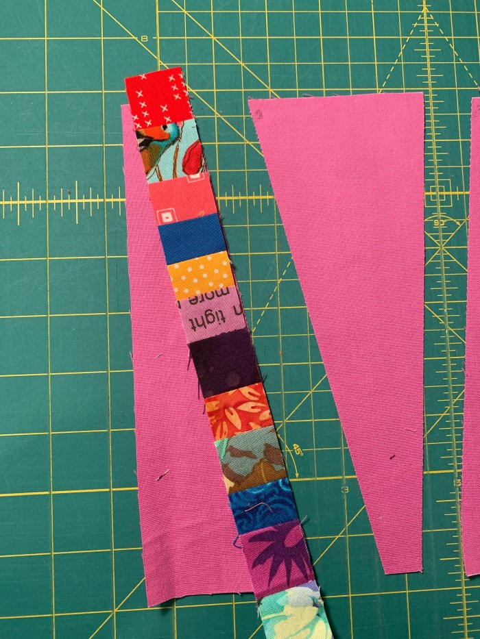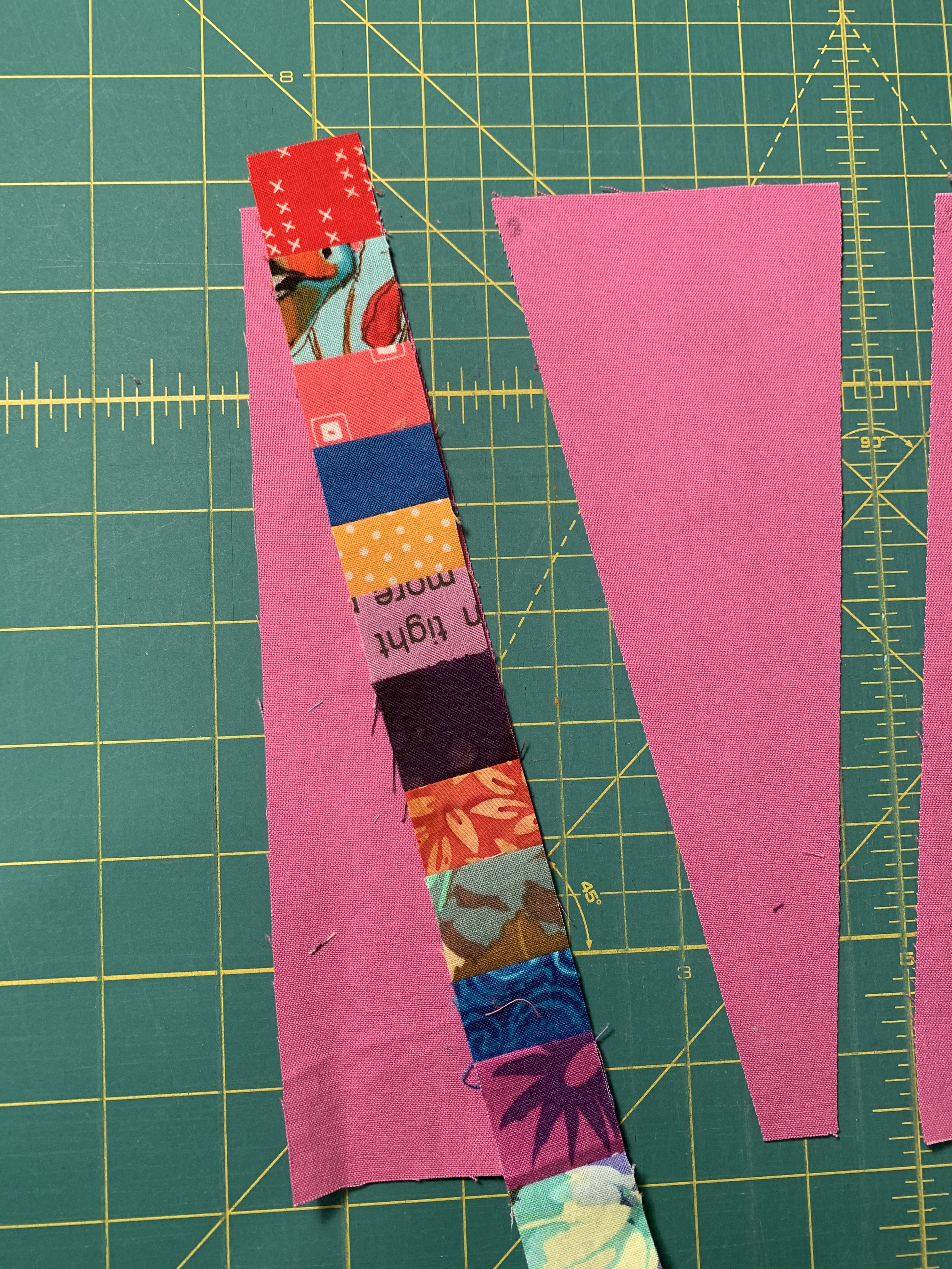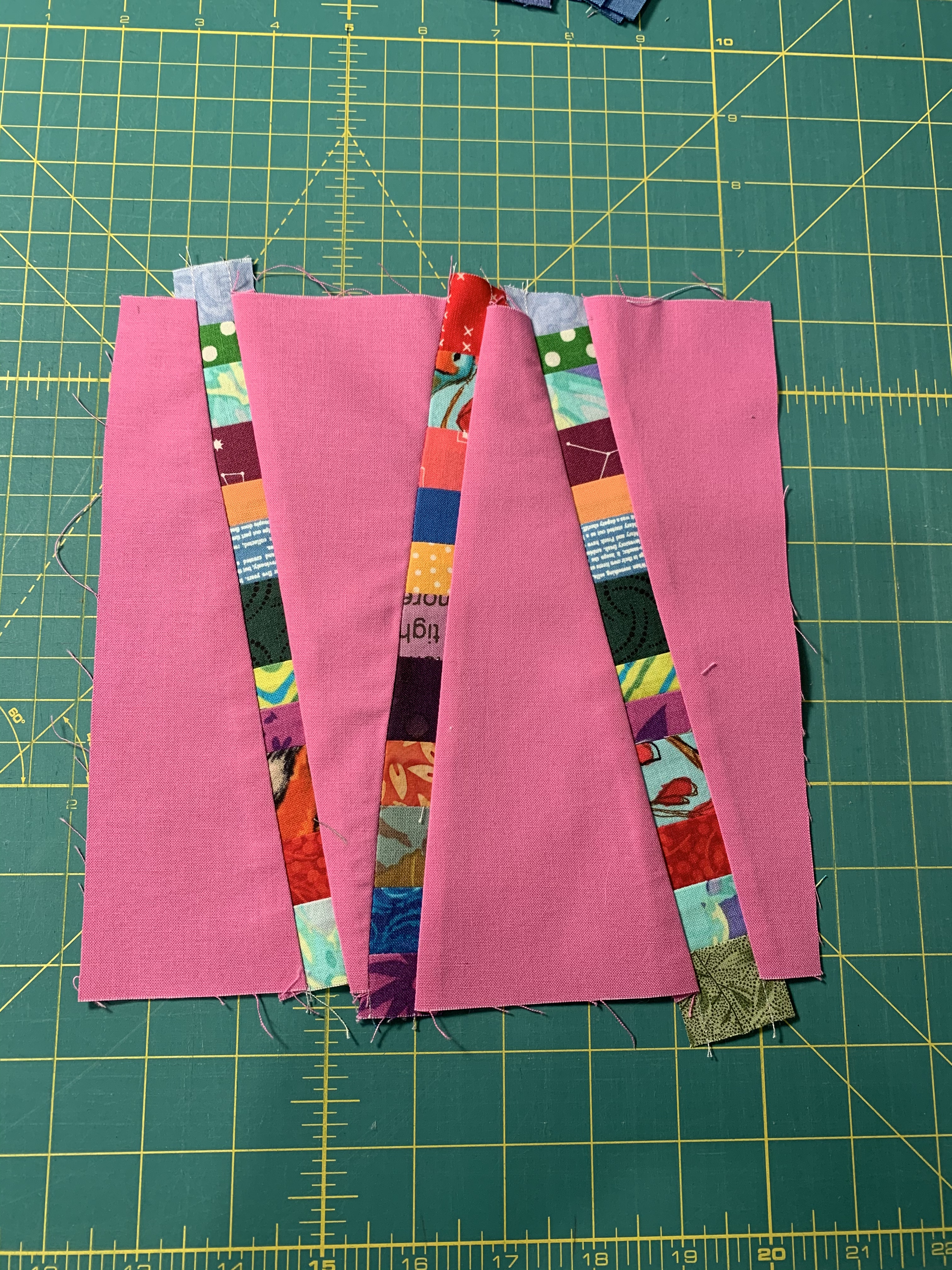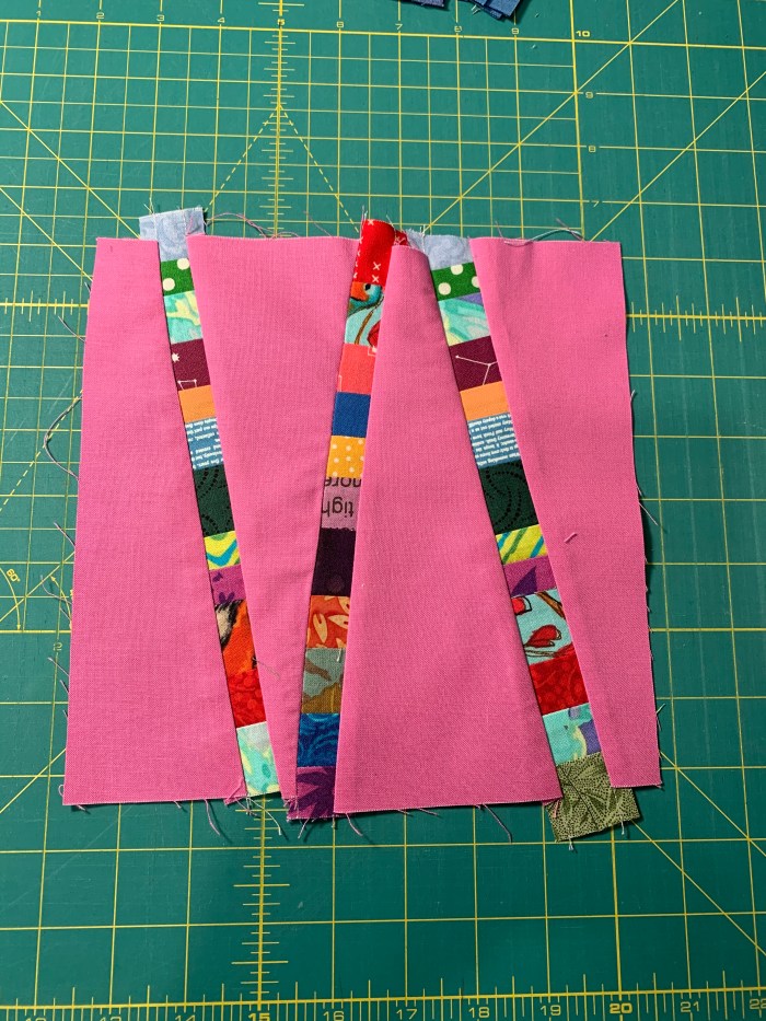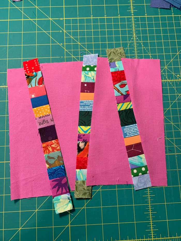 Here’s my plan for this block. When you sew try to keep the top (pink) edge about the same if possible. You can see here that I didn’t do that as neatly as I like. Lay your strip in, put a pin on the 1/4 inch line, and turn the strip to see if your background fabric is lined up better than here. I don’t worry so much about the bottom edge if this top one is fairly even—since I won’t lose too much fabric on both sides, just one.