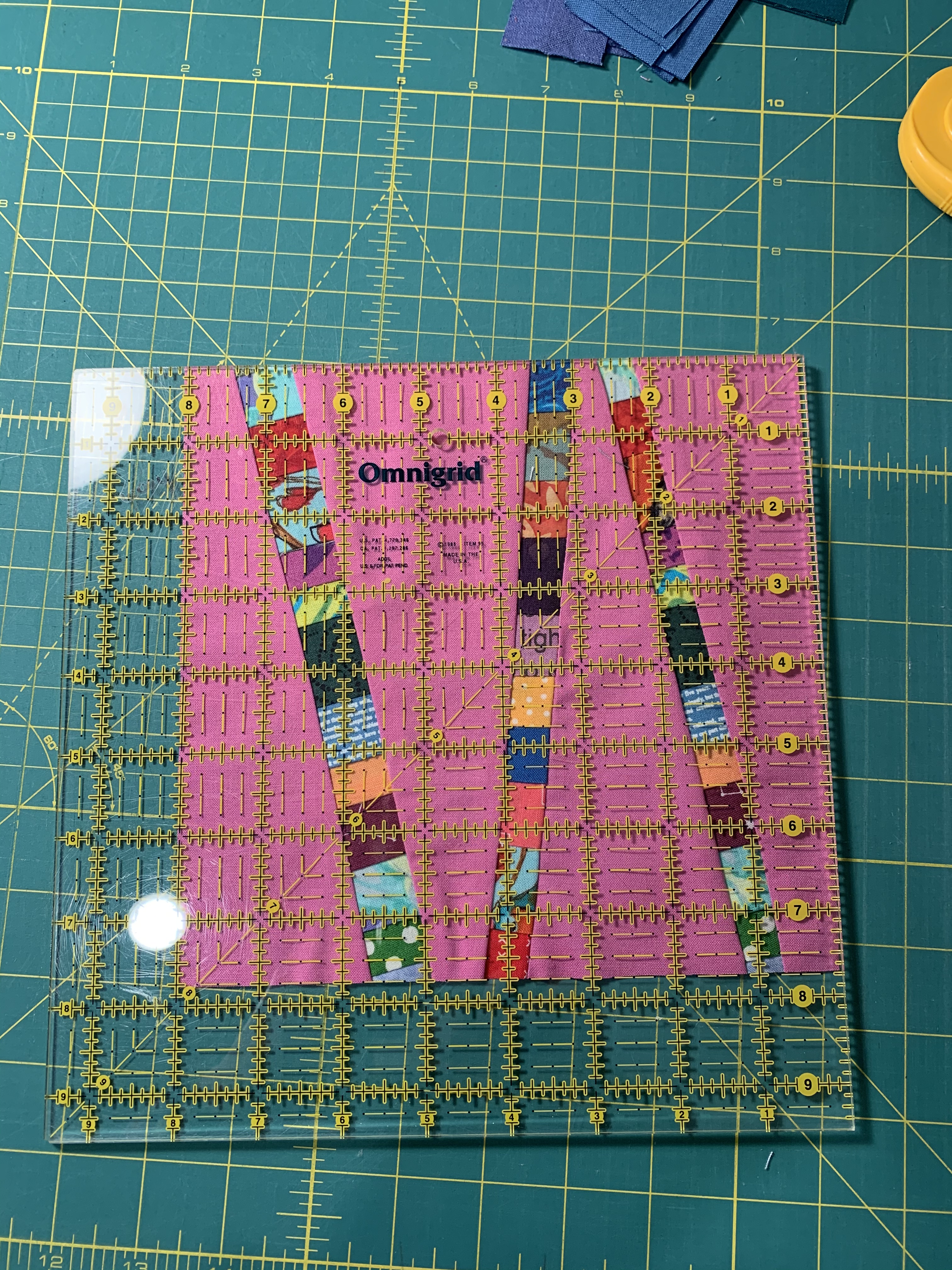 So now it is time to trim to 1/2 inch bigger than your finished block when sewn—so my 8 1/2 will now go to 8 inches square.