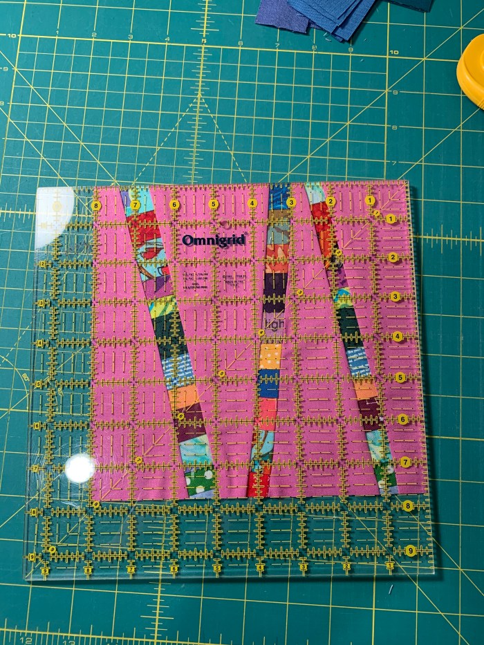 A square ruler REALLY helps with this trimming as you can see everything at once that you need to consider and can see how to best trim ALL the sides and if there is some problem with size. Honestly, I use my different sized square rulers a lot. I trim two sides, then flip the block around, line up again, and do the final two sides. (This block is 8 inches and will finish at 7 1/2—the ruler is just a bit high on one side in this picture as I relaid it in for this picture.
