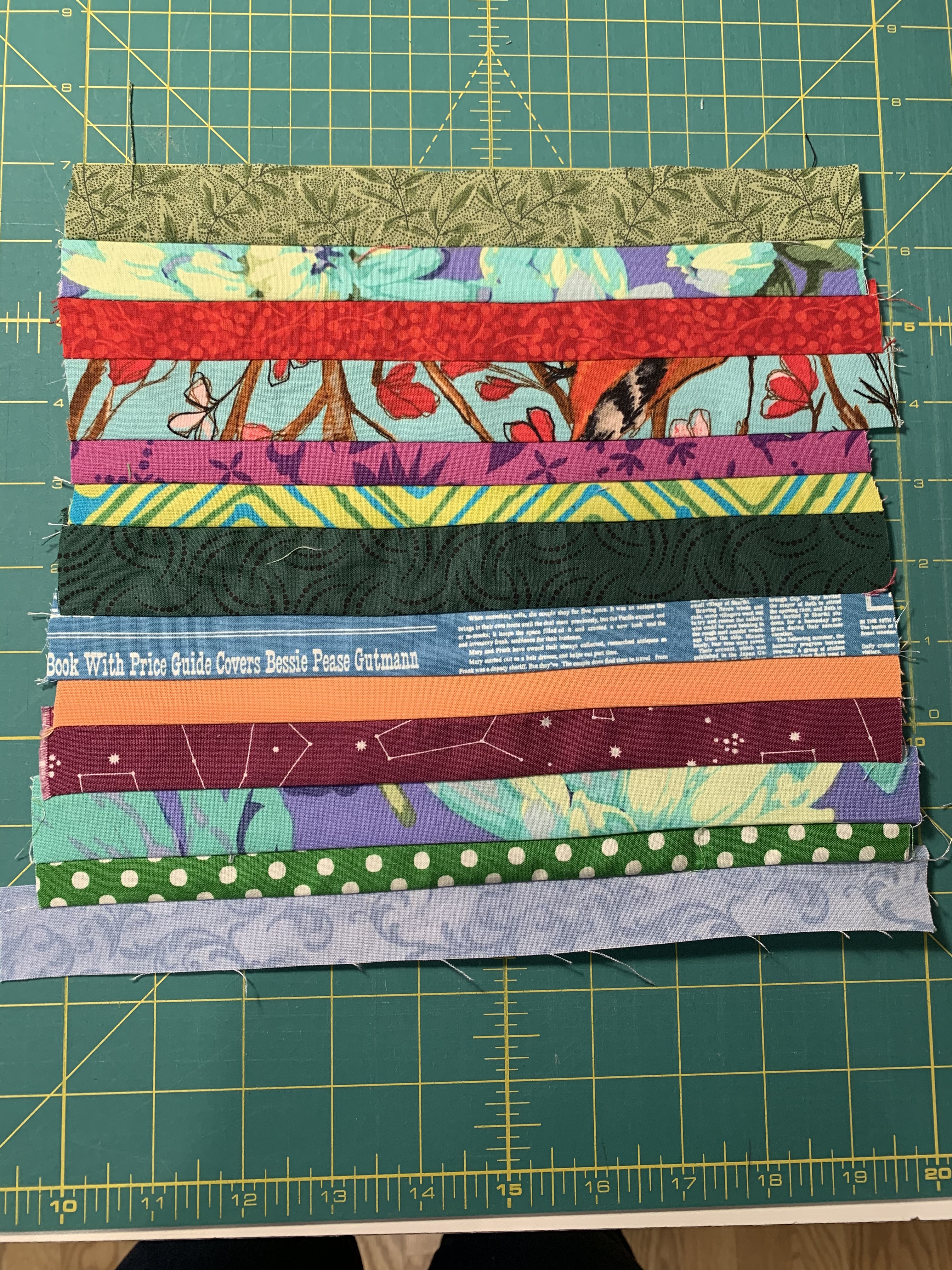 You will have already made a swatch of fabrics that will make the tree trucks. I cut these strips randomly at 1 inch up to 1 1/2 inches. Then I cut the trunks at 1 inch for most, but add in a few 1 1/4 inches. Again you can see how the widths work out in the first picture of my completed blocks.