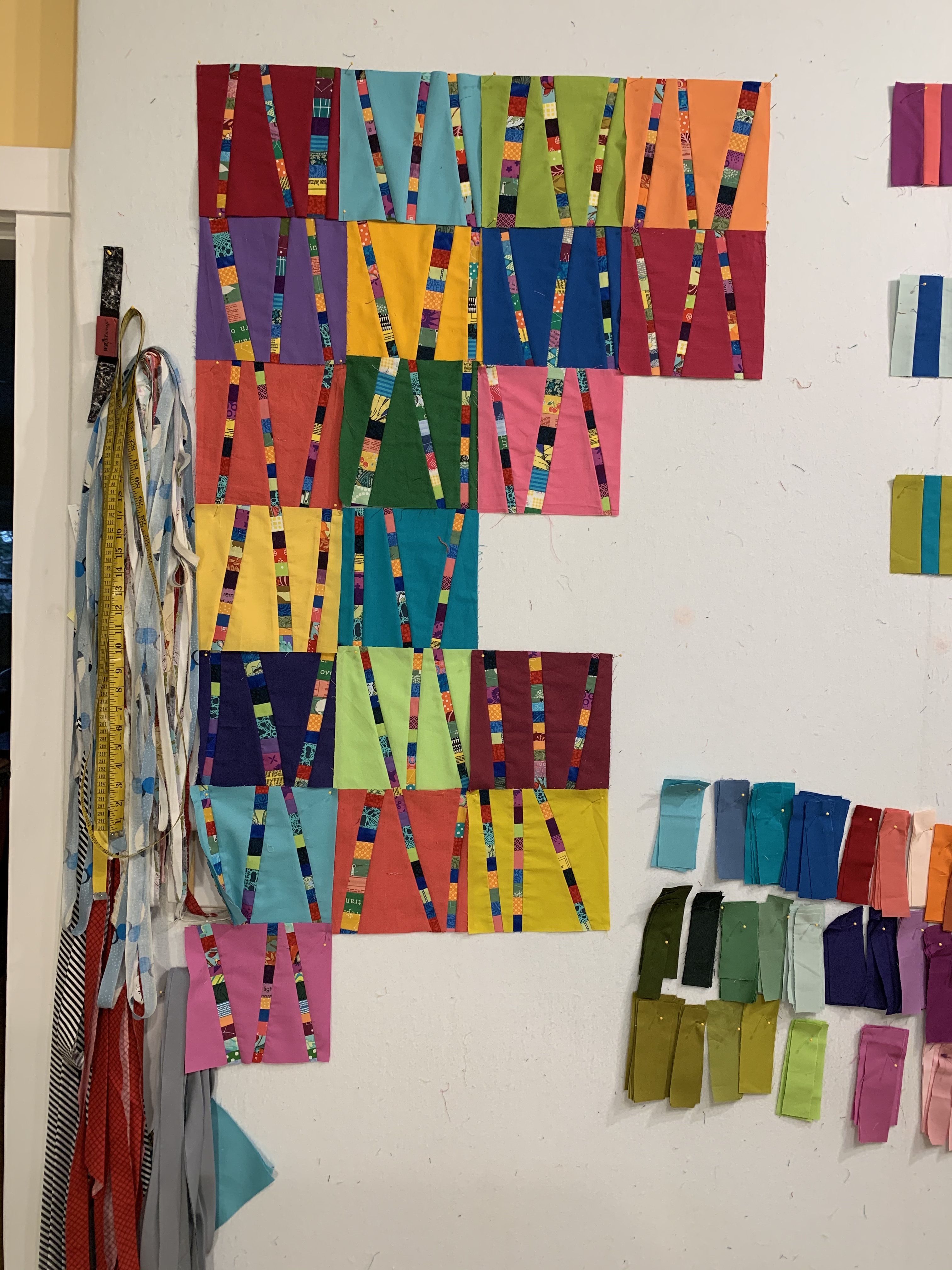 My own blocks are moving along quite nicely now as a leader/ender project, and I am pleased with how this project is shaping up. Note that I have used some different sizes of the “tree” trunks—for me about 2: a 1-inch cut and a 1 1/4 inch cut. And this arrangement will not likely remain after I have more blocks done. I’ll refine placement then by color and by how the trunks relate from block to block.