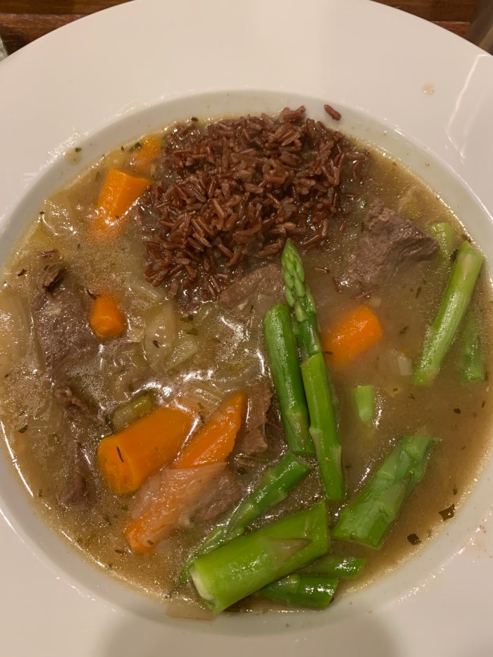 Here is a lamb stew (with added rice and asparagus when plated) that came out with tender, tasty lamb chunks and carrots that were NOT overdone. The sauce was thickened with the addition of a flour at the start—for me cassava, which I can eat.