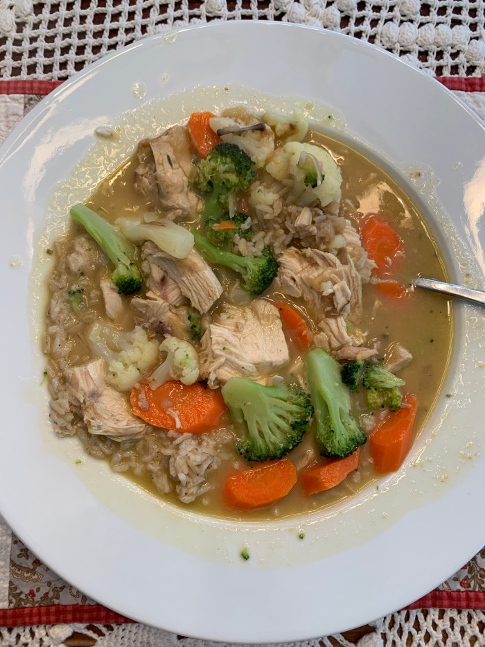 I cooked some chicken breasts in 14 minutes in the Instant Pot last night! So I had delicious leftover tender and tasty chicken and a cream-based sauce made with onions sauteed in ghee and with some heavy raw cream, dried herbs, and a bit of mustard added. I added more chicken broth to the leftover sauce after I put away the groceries, and quick-cooked some fresh broccoli, cauliflower, and carrots in the sauce while I got the chicken off the bone. I added the chicken and poured the whole thing over the leftover rice from last night. I cooked a whole bag of sprouted brown rice in the Instant Pot some days back and froze the extra rice in individual portions.