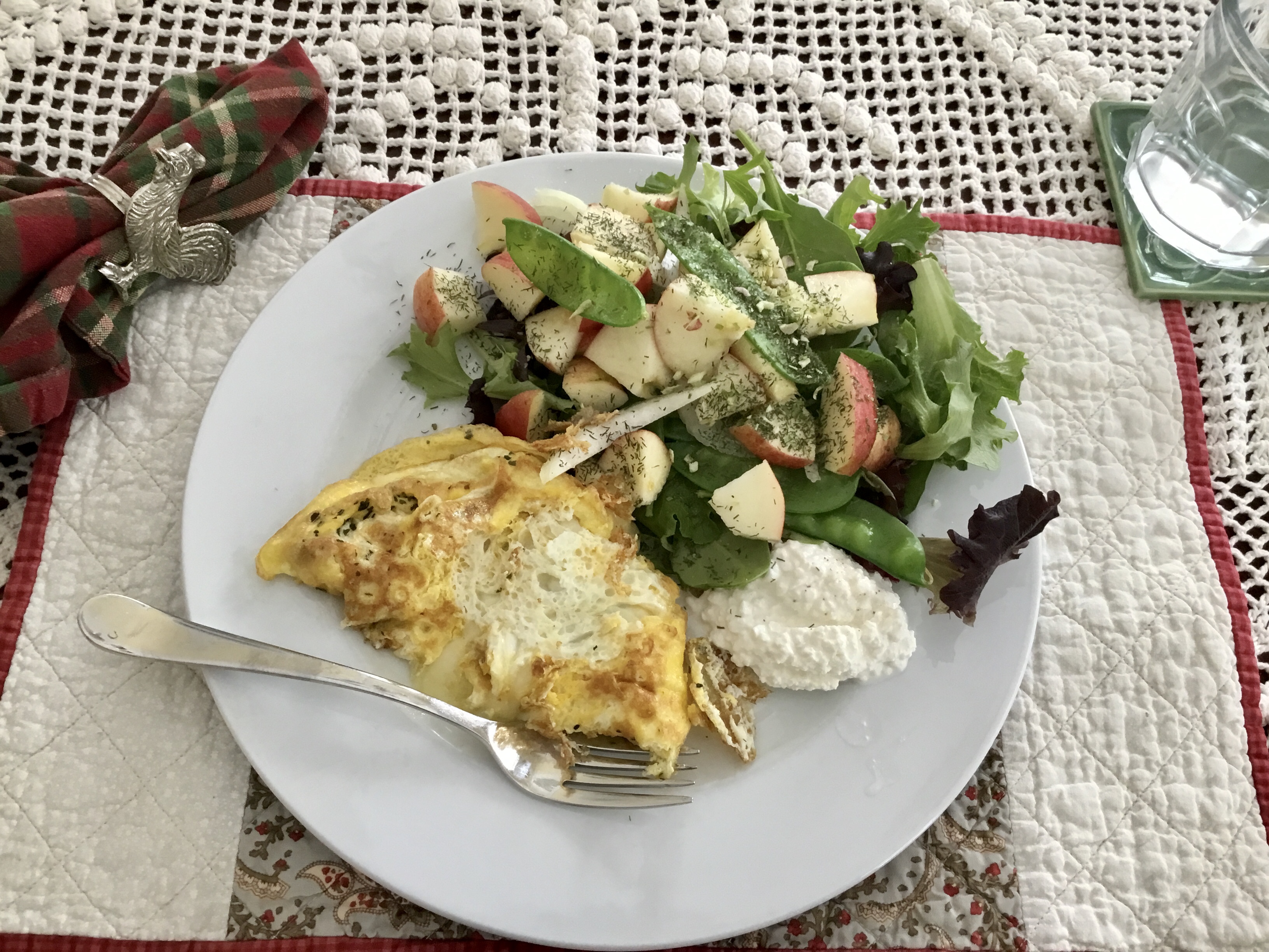 This lunch made me feel like spring is coming faster now: a mozzarella, herbed omelet, cottage cheese, and a lovely salad with the snow peas just showing up in our markets and sweetened with cubed apple. (I flipped over my omelet getting it out of the pan, so part tore off just a bit.)