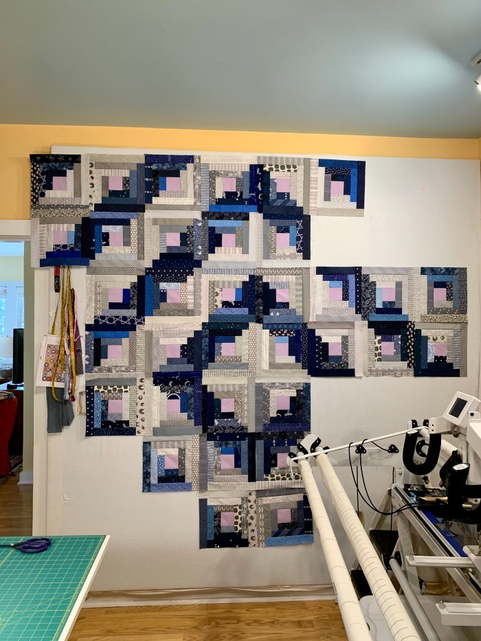 I’ve been working on the log cabin quilt for my niece and have a bit over half the blocks done now. It will be 8 rows by 8 rows, or 96 inches square.