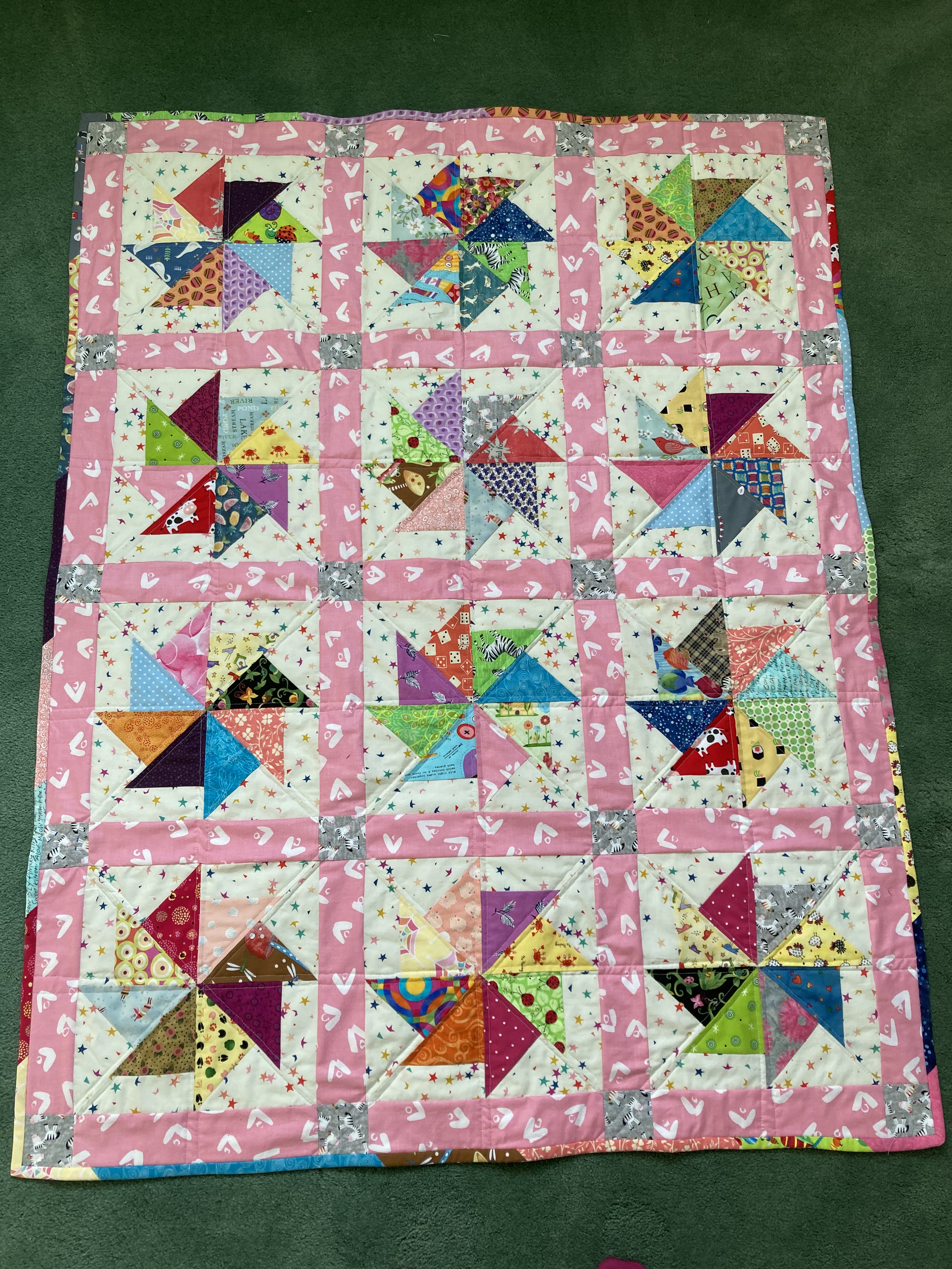 I love this pin wheel block quilt she made—and this is the second one of these. What I especially love is the star print background behind the pinwheels. I think that is a Cotton+Steel print. Anyway, it just makes this quilt sing, don’t you think?