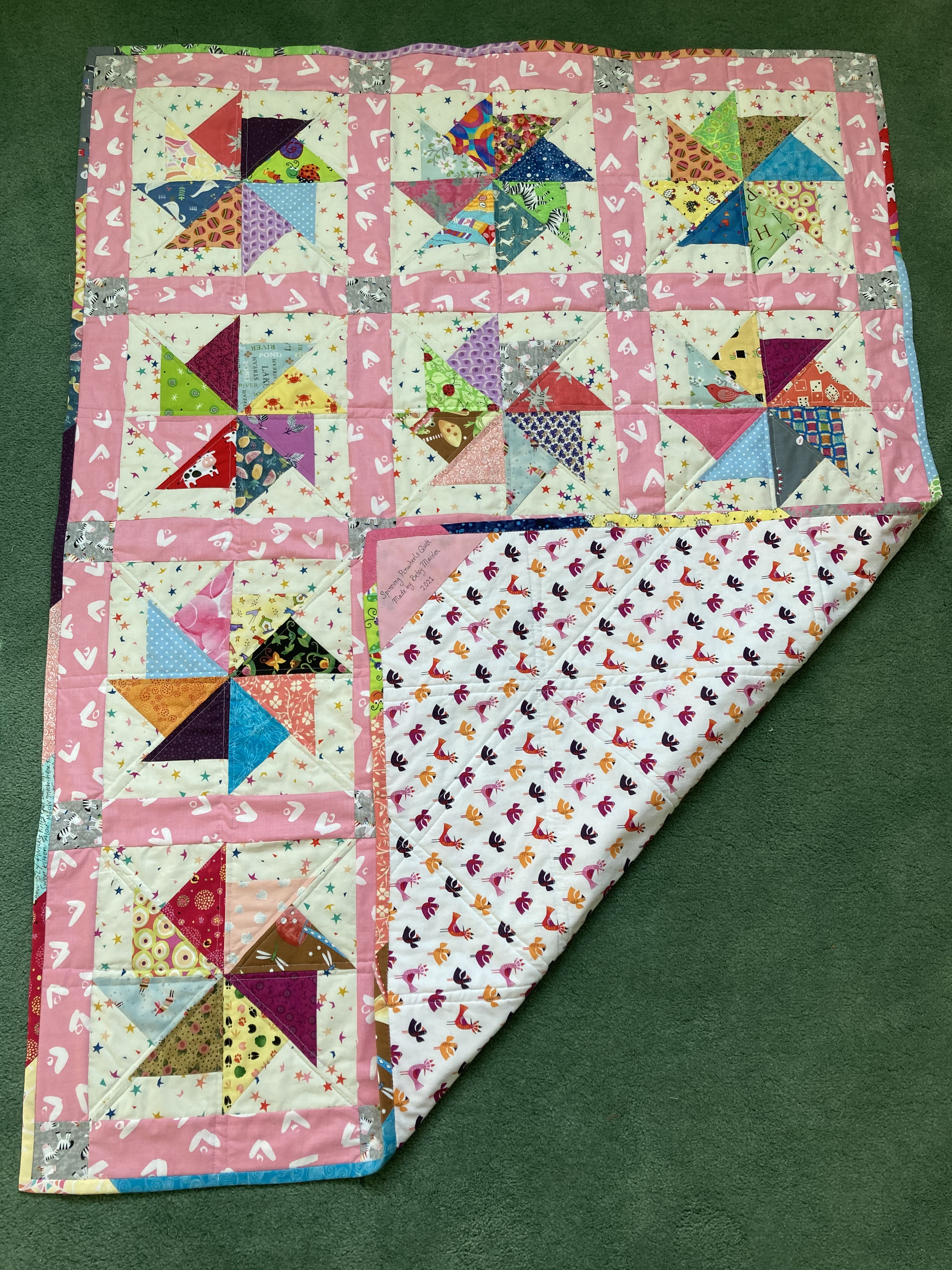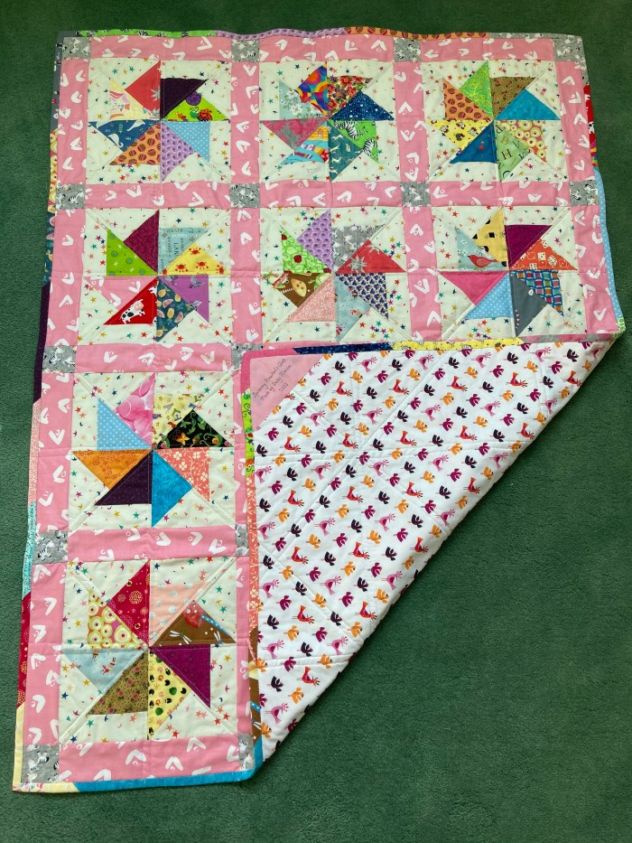 That is such a sweet and fun quilt…her colour choices are fun and I esp love the back!