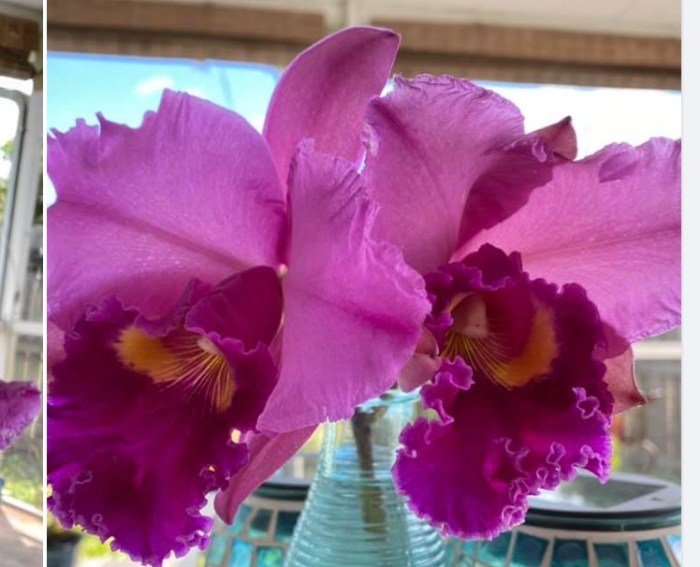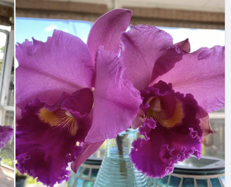 “Our daughter in FL always looks forward to her cattleya orchid blooming every year. She has to time it just right to pick the blooms before the iguanas eat them-Look at the picture and see the iguana coming down the tree to get it as she is cutting it. Think they must smell them. The orchid has grown all over the tree.”