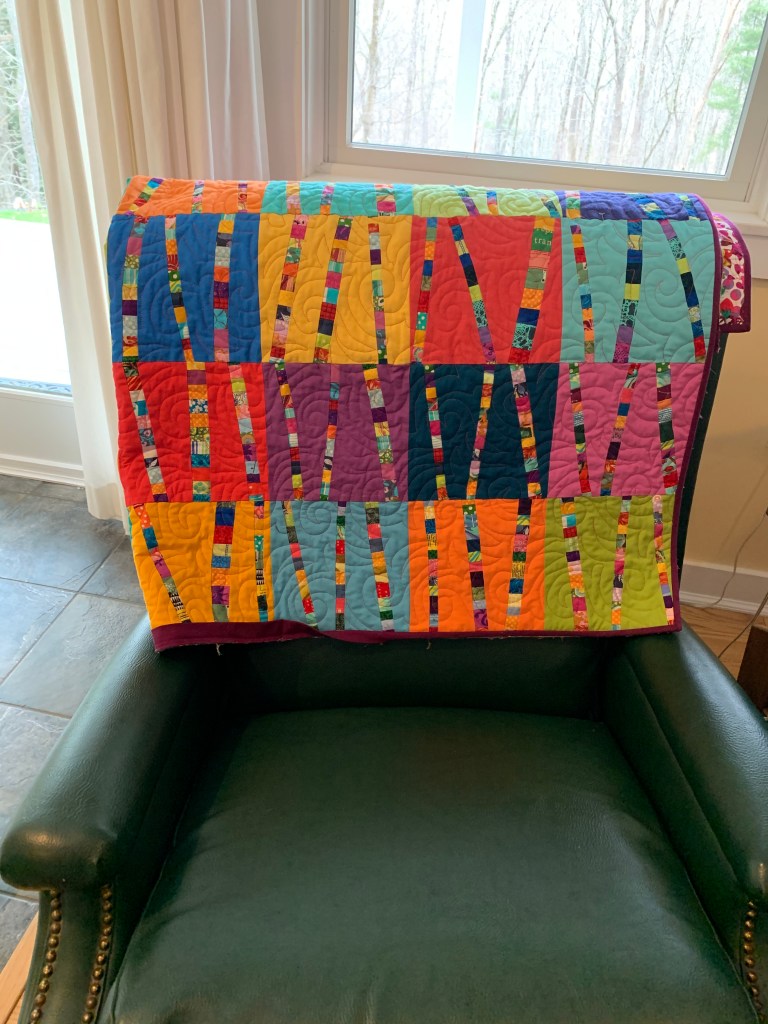 ”Trees” now has a name: “Bright Birches.” It is so funny to me how a quilt will name itself at some point. This one didn’t like being called just “Trees.”. Sewing down the binding is coming along.