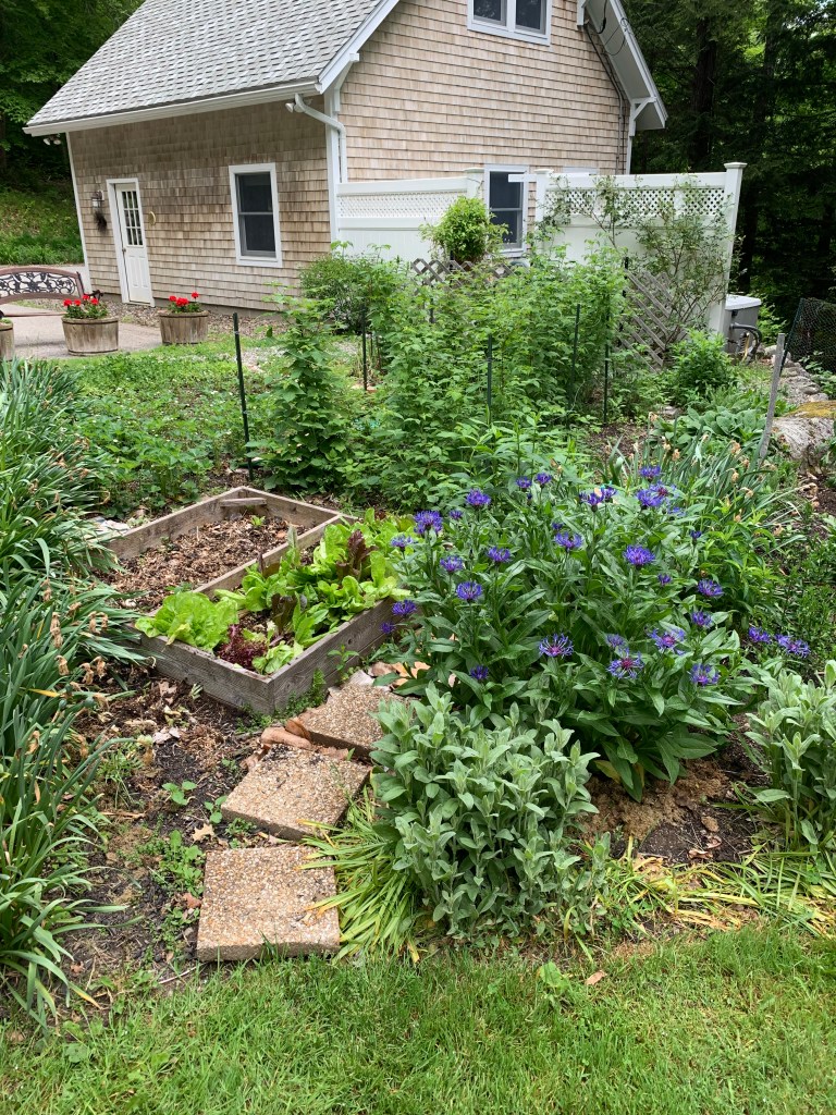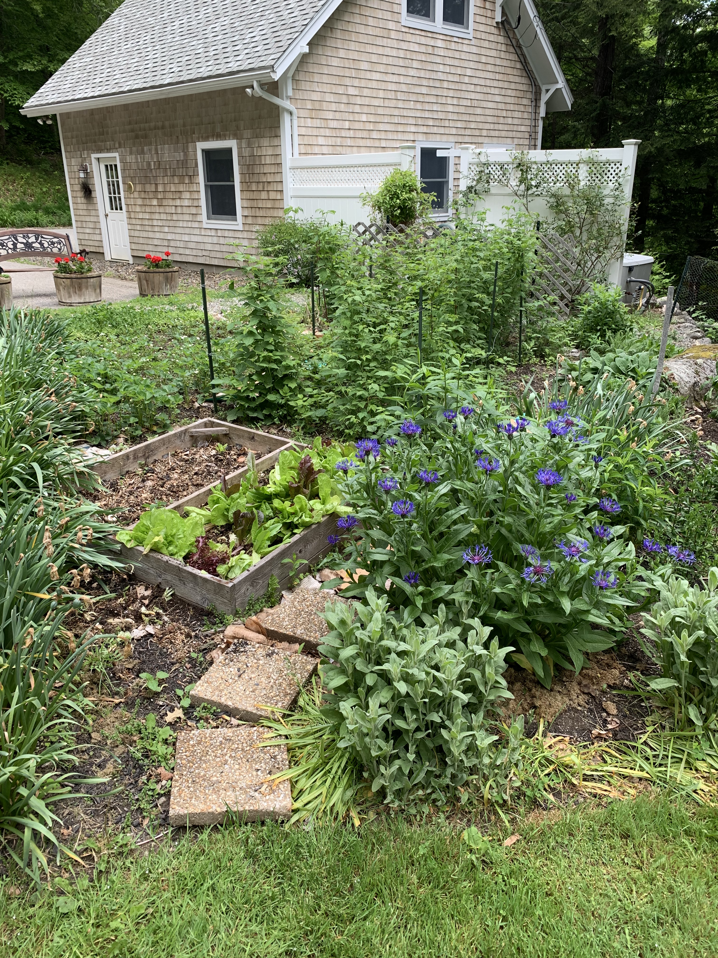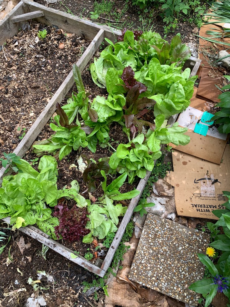 The lettuce in the cold frame is close to bolting. I’ve cleared one side—and have delivered this beautiful lettuce far and wide to friends here. I get so much pleasure out of sharing this lettuce bounty. You may recall that I set up the cold frame in the late fall with lettuce seeds and cover it for the winter. At some point in the spring, it sprouts and grows, with me taking the cover off and on to harden it off until the weather is more reliable. I’ll put in more compost and replant soon now: filet green bush beans on one side and maybe a zucchini plant on the other side.