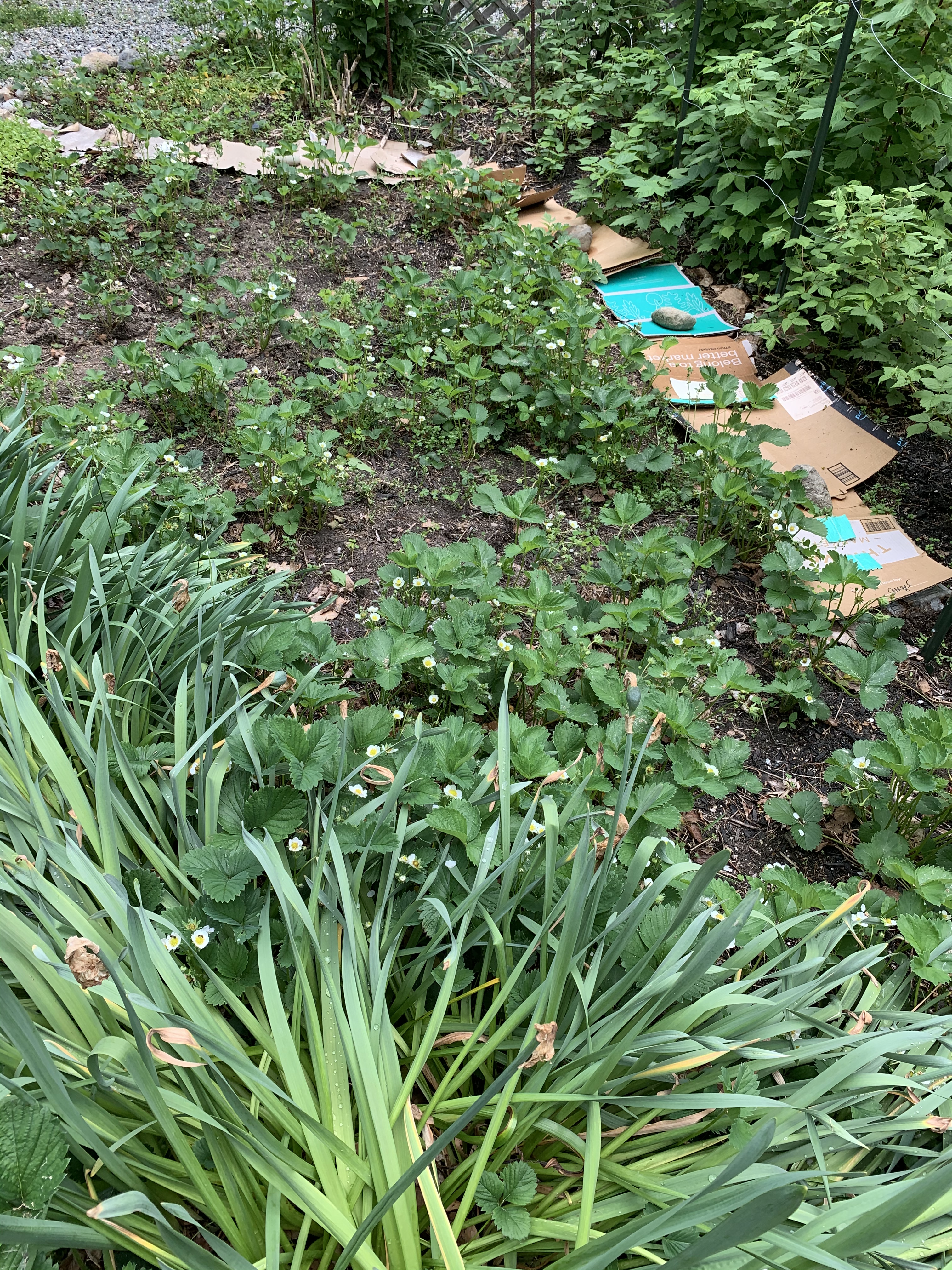 I started with the strawberry bed—and it needs a another weeding pass again. The fruit is starting to emerge and set now. Other than weeding and some thinning later in the summer, the strawberries take care of themselves. I have not had to replace strawberry plants for some years now. They will get some mulch in the next few weeks.