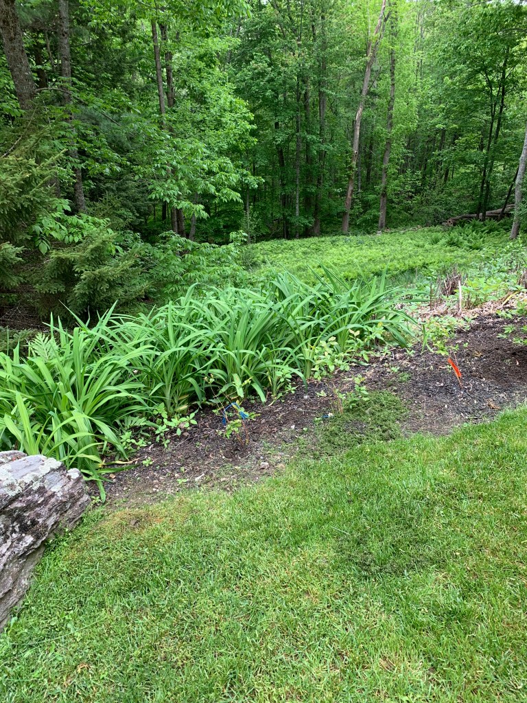 The daylilies lining the crest of the very difficult hill were planted last spring by Leslie Smith (Smith Tractor), who dug them out of this overgrown bed in the picture below at the far left of the hill—which freed up space for the new blueberry bushes I planted last spring too. All of the transplants came back and are now increasing in size.