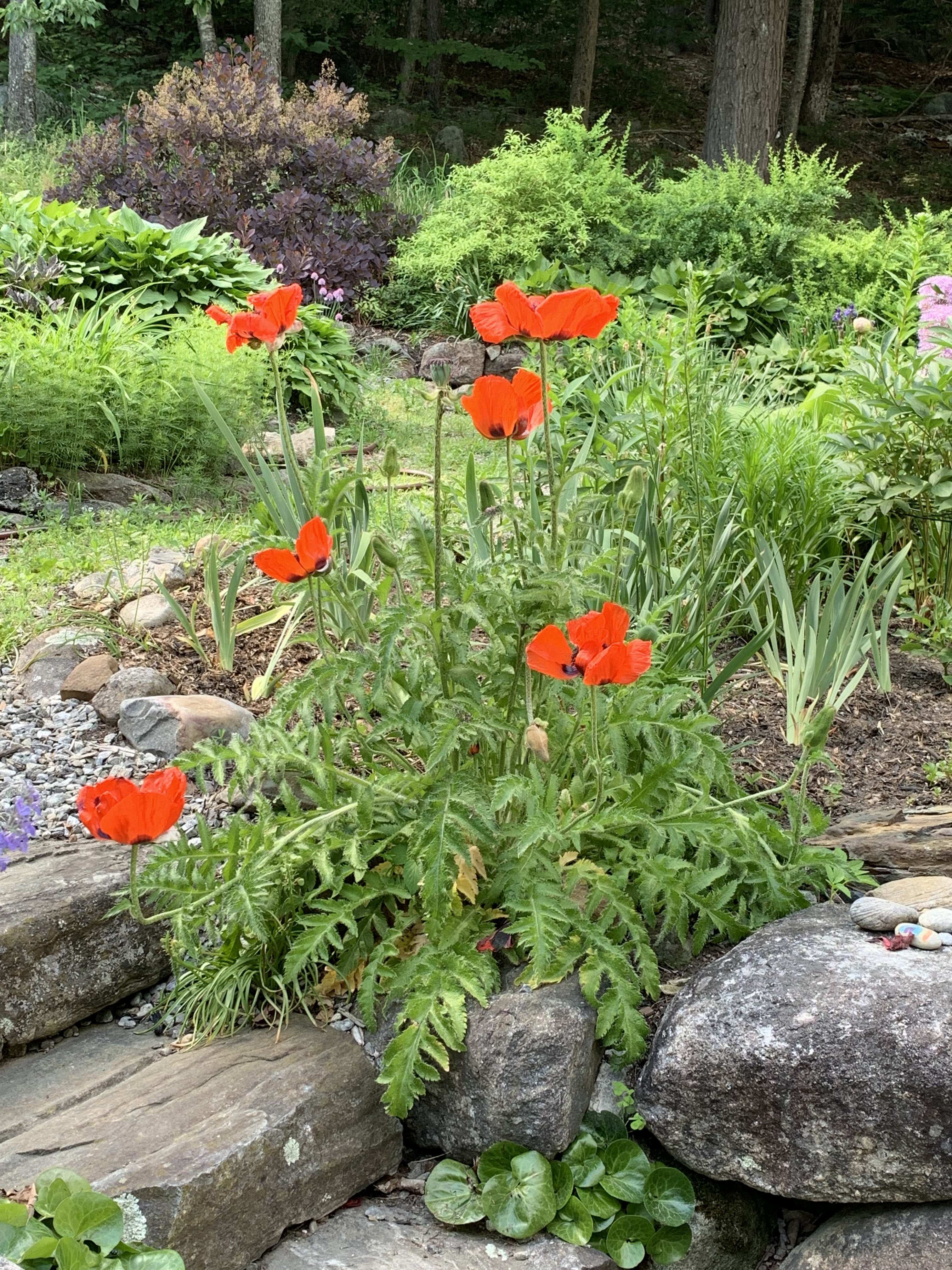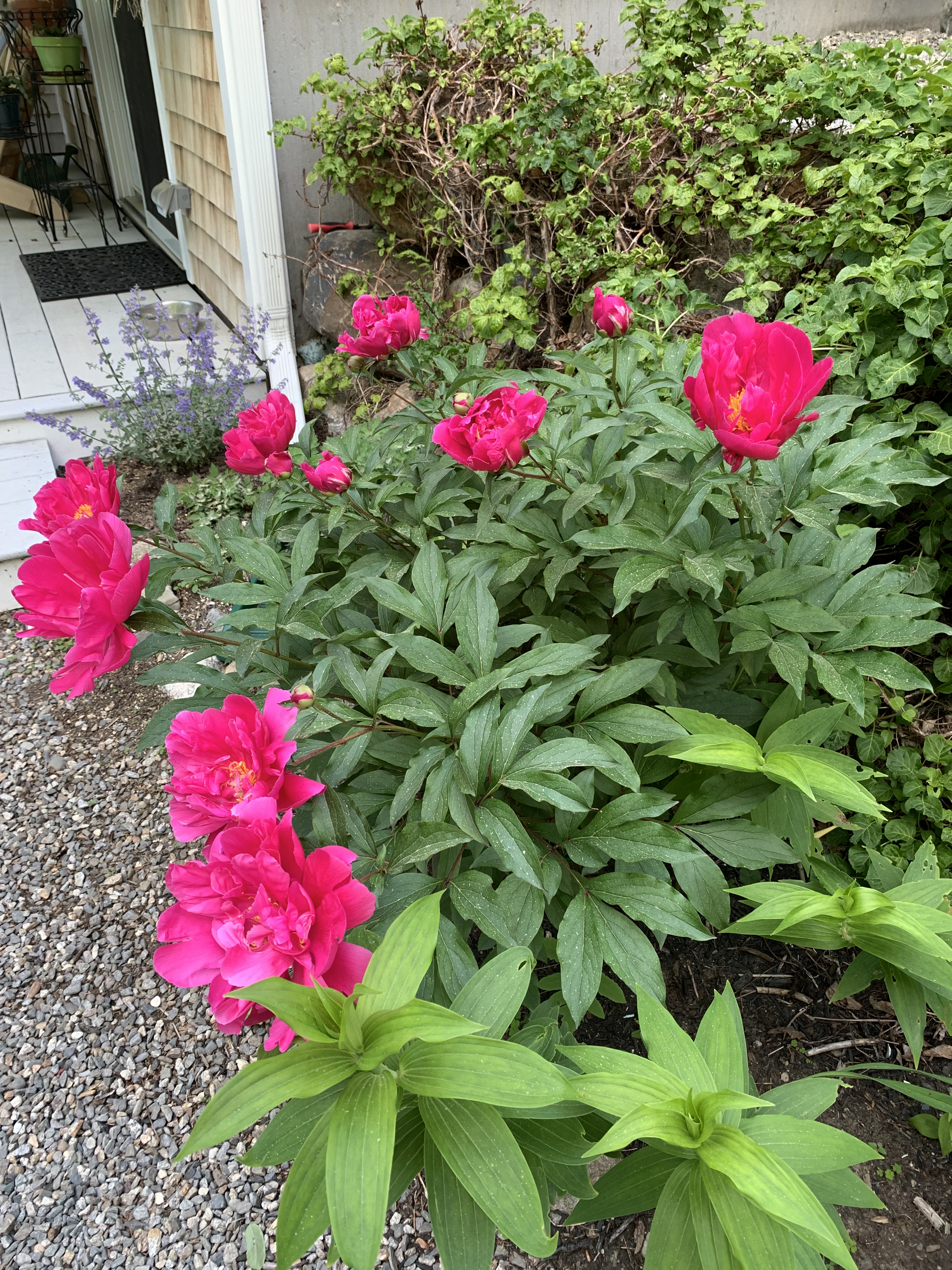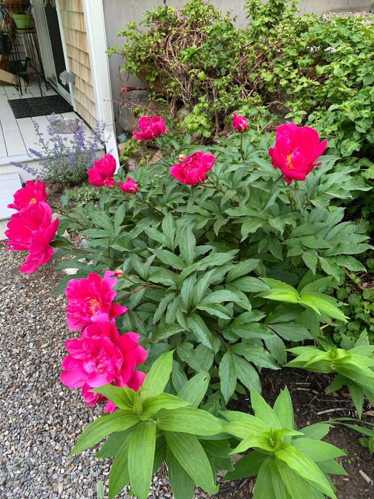 The peonies are also in full bloom now. And those are white Easter lilies alongside—which will bloom later in the summer. You can also see the new Cat Mint plant by the deck steps. I’m trying it out in that tricky spot where I dug out the Ladies Mantle last year. The support board at the edge of the deck was rotten and got replaced a few weeks back, thanks to Shane Chontos.