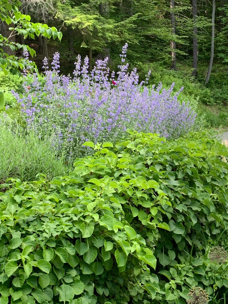 In this spot, the Cat Mint plays off of the established Cat Mint plants at the edge of the rock wall that lines the pathway to the house.