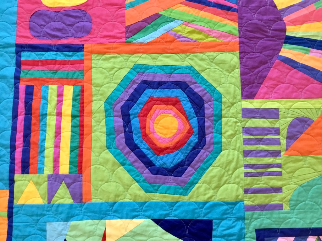 So, this quilt holds many blocks made by Mt. Battie Modern Quilt Guild members who are participating in this challenge. I really enjoy the creative work of trying to make the blocks all “fit” into a coherent presentation.