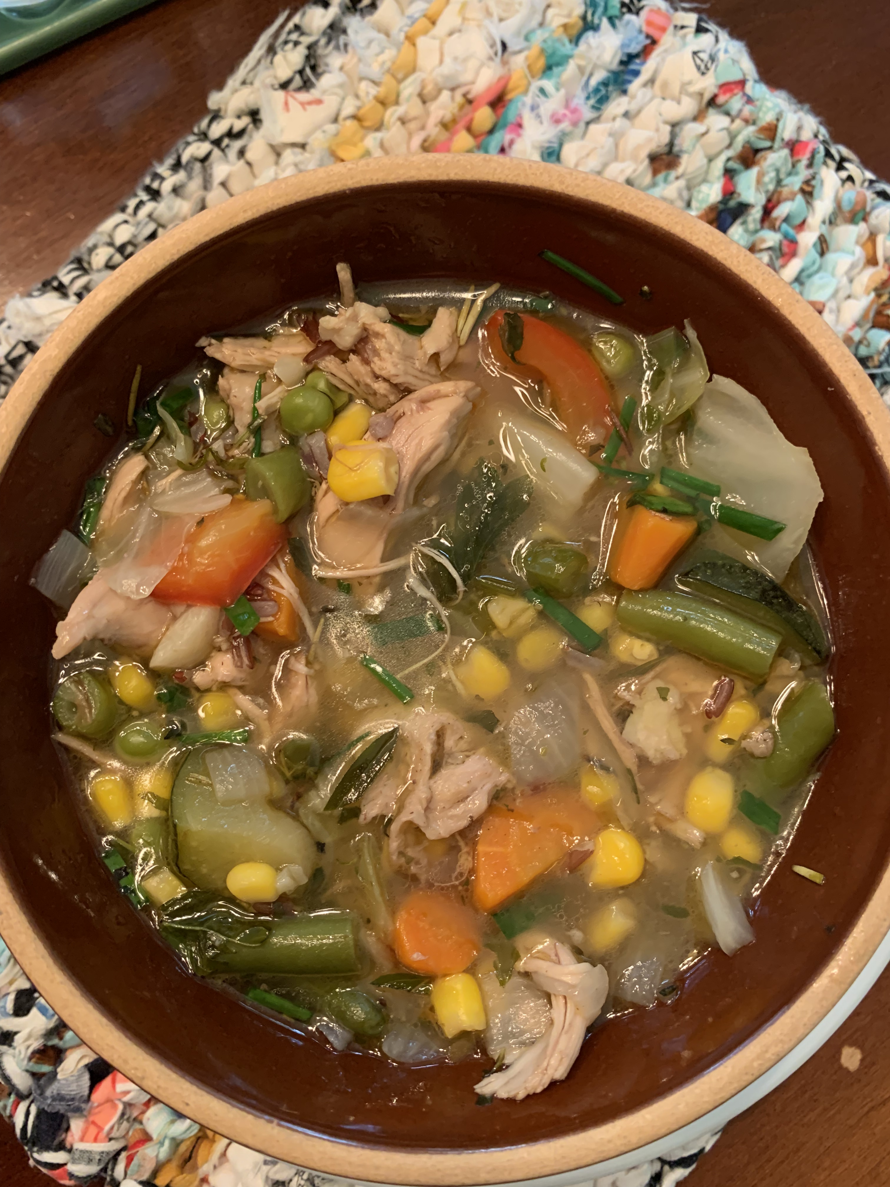 The collected chicken bones in the freezer were taking up too much space. So in the middle of the WORST heat of this year, I made chicken broth. And the next day, I made a HUGE soup.