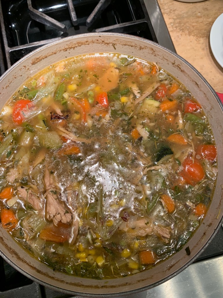 I soon had to switch to the larger Creuset pot though—as I added all the chicken meat from a whole deboned chicken (which went into the bone broth to cook) and veggies from the freezer (corn, beans, peas) and some “Forbidden” red rice.