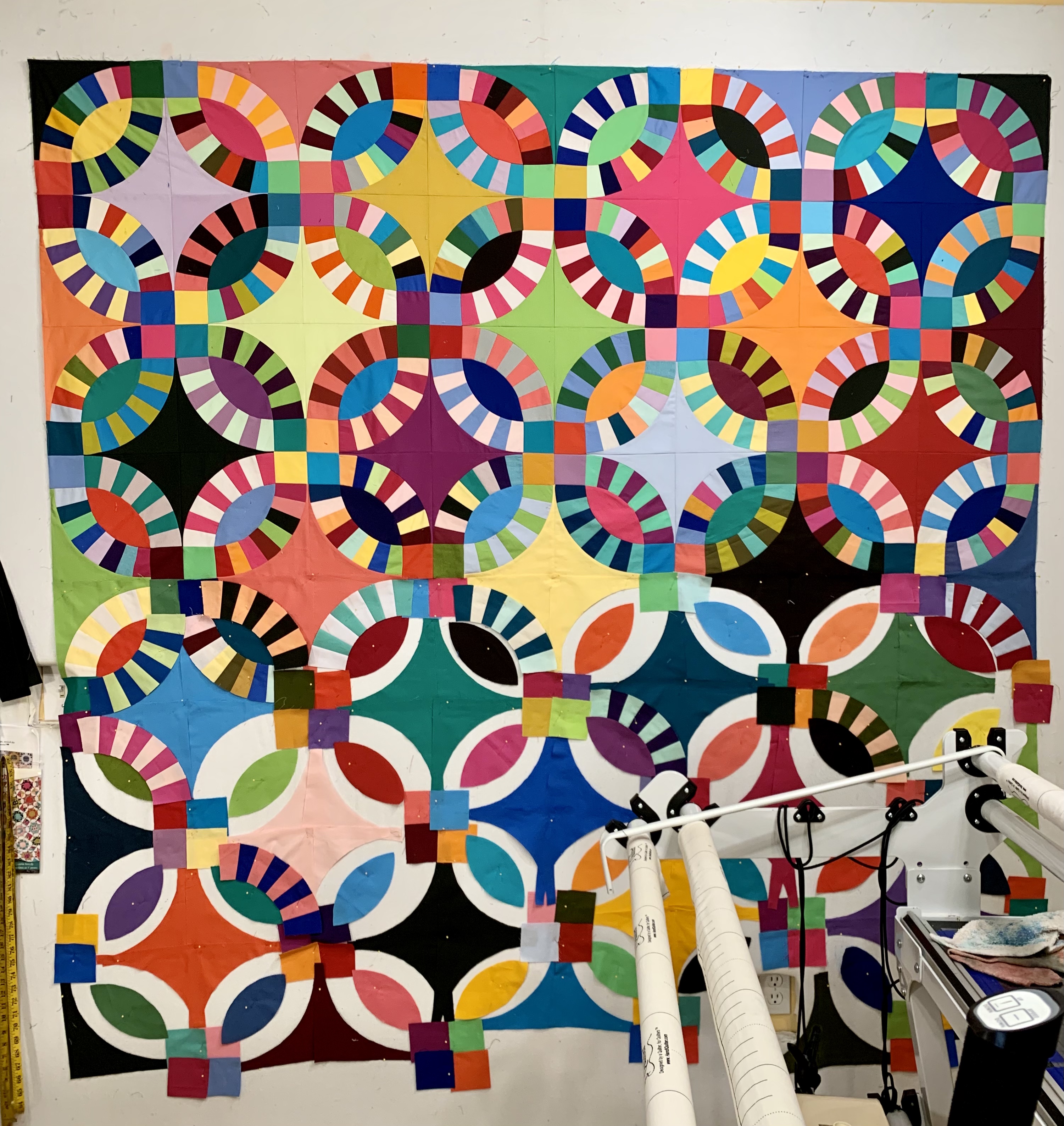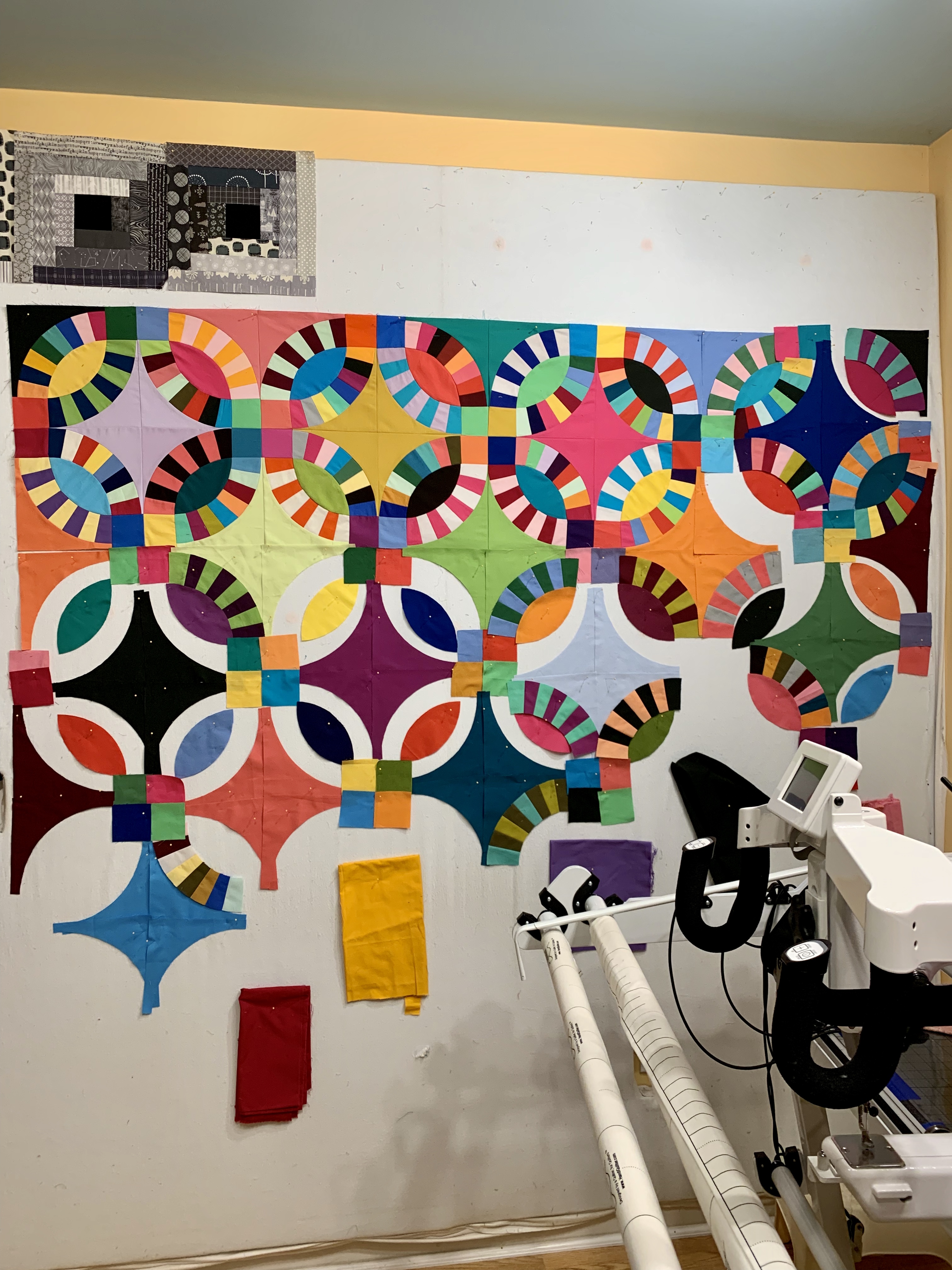 I finished the scrappy wall hanging I have been making from the “offcut” quarter circles left over from the last project of this year’s The Color Collective season. The 7th and final month’s project this year was designed by Latifah Saafir. I loved her block (Tenderoni) and also loved her color palette.