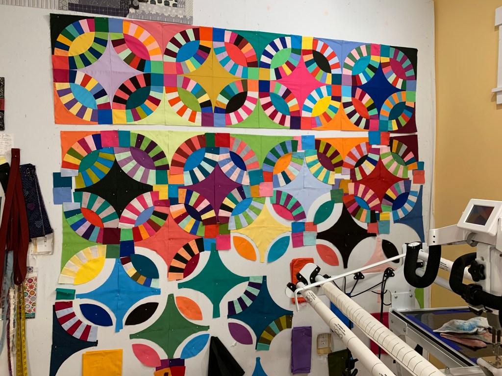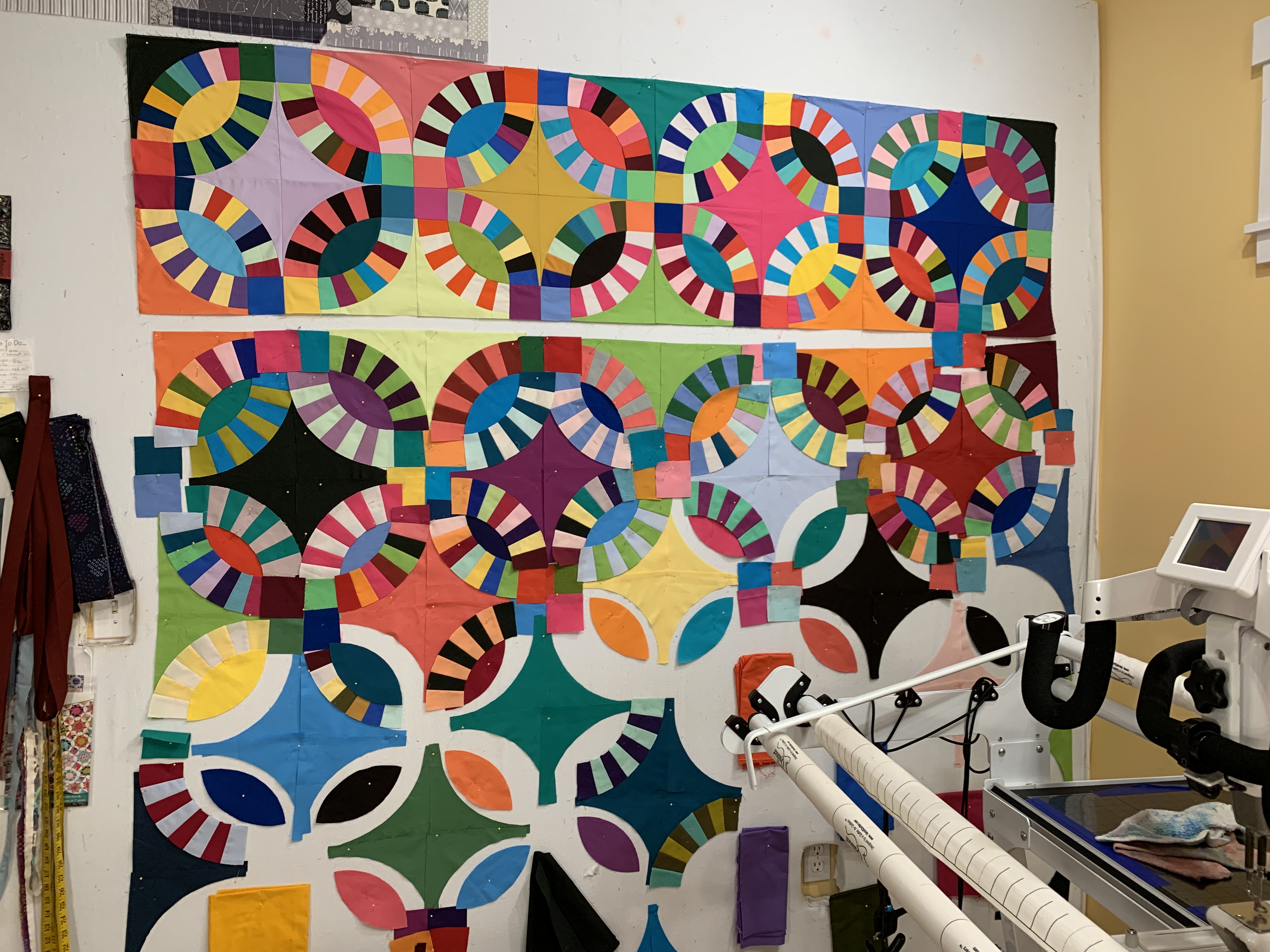 I’m still moving around color, but, hopefully, will sew the second row today. I just need a few more of the circles completed. I never how how they will look until I put them in place.