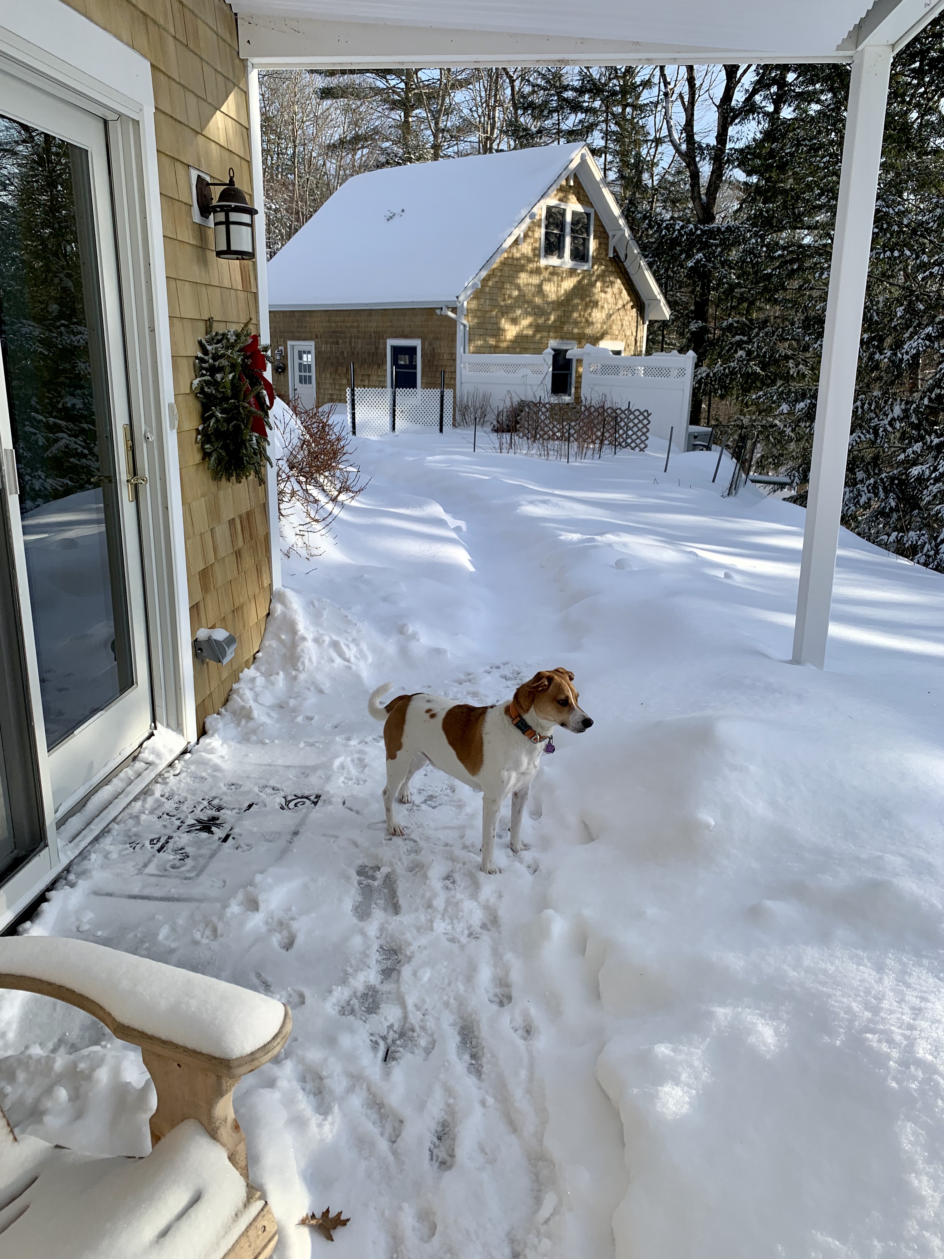 Today dawned sunny—the storm is gone. It’s 10 degrees. The snow is light and fluffy, so fairly easy to shovel. But there is a lot of it—at least 18 inches up here on the hill, but the drifts are deeper of course. And light snow sticks to one’s boots and gloves.