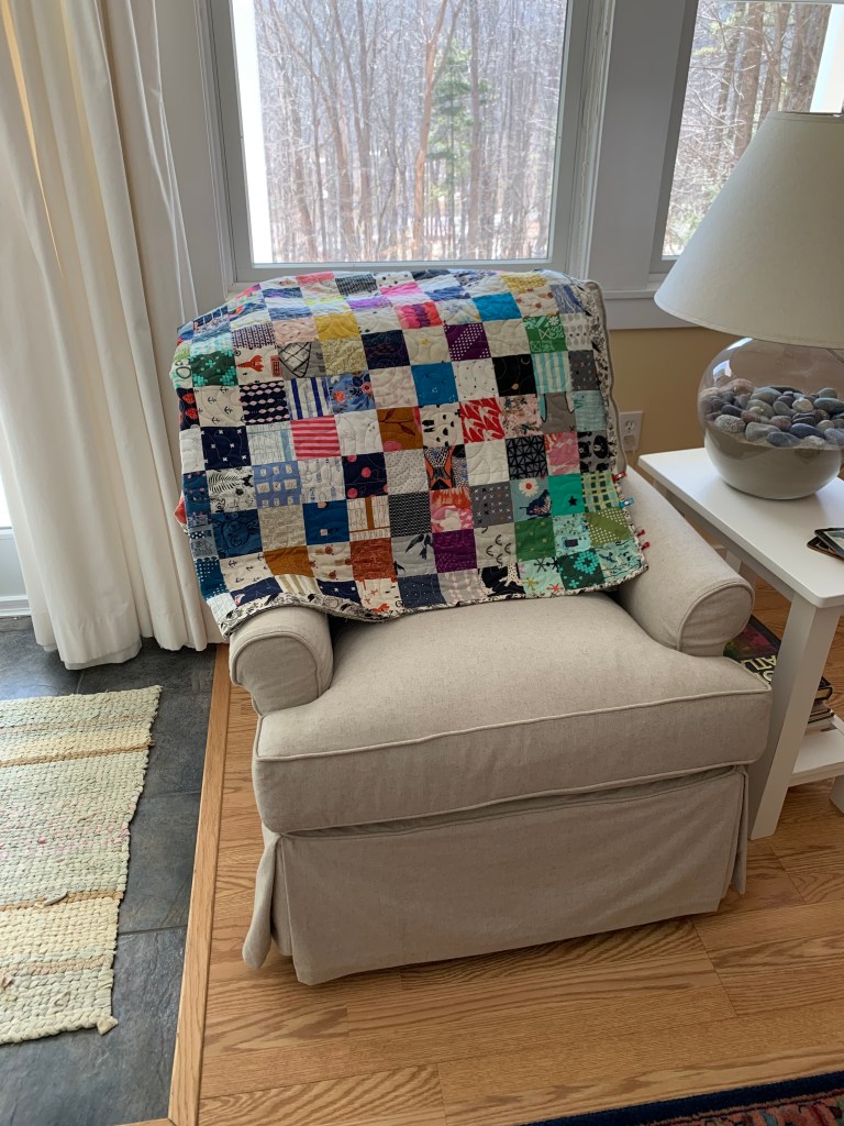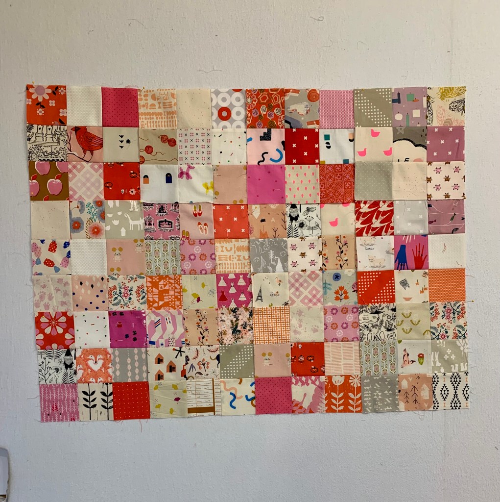 And here is where many of these are going: baby scrappy “Pot-Pourri” quilt number 3. It’s meant for a girl child, and if here are no takers, note that I am a girl child of this earth.