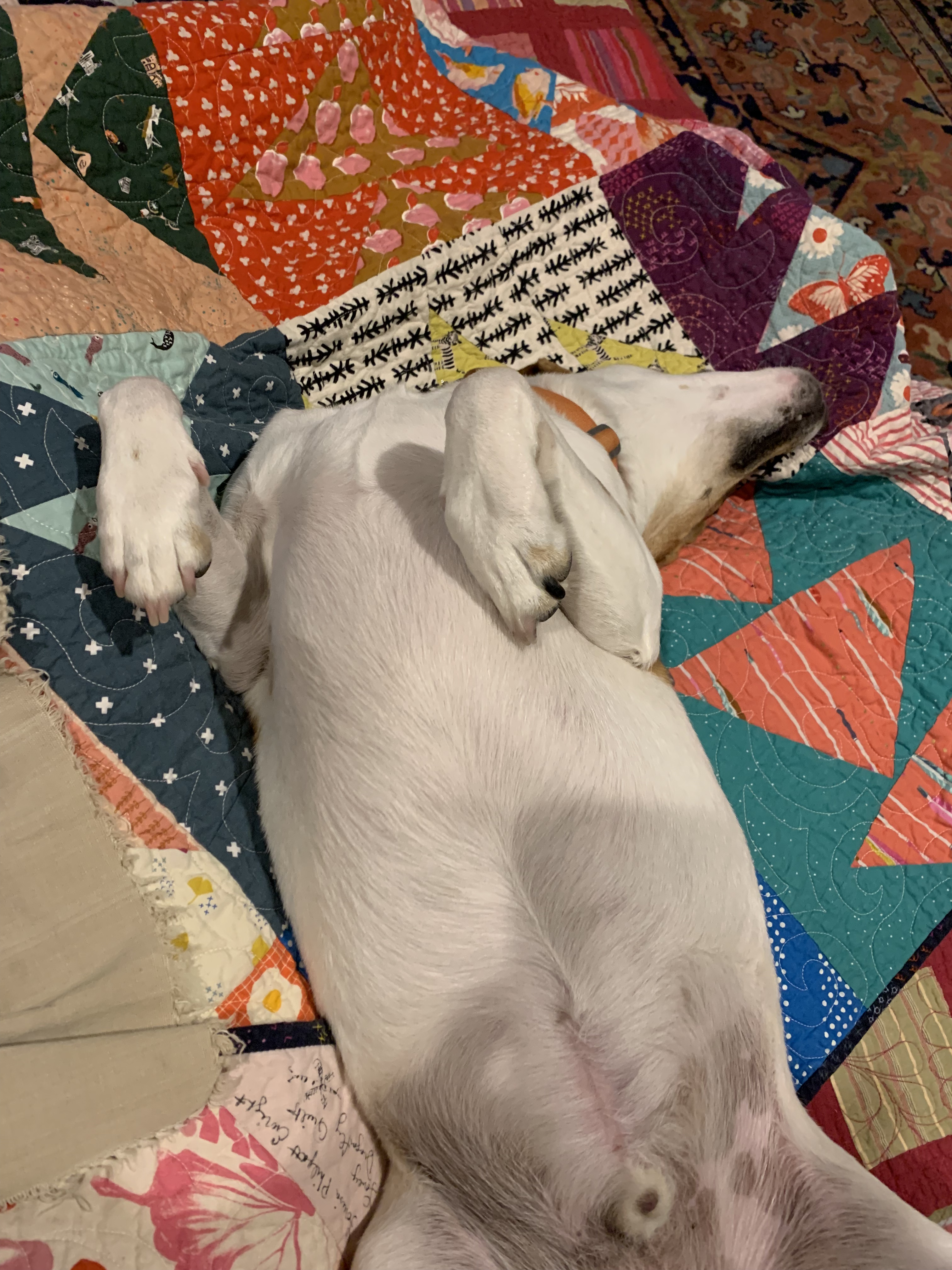 Meanwhile, AC knows exactly when it is 6 pm, and he ”dogs” me until I stop sewing and give him his dinner. “Dogging” can be milling and prancing around my sewing chair and/or butting me with his long nose. Below is what he really wants: both of us settled on the couch, me watching tv and hand sewing, and AC presenting his belly to be scratched. How’s that for a display of utter safety, warmth, and trust?