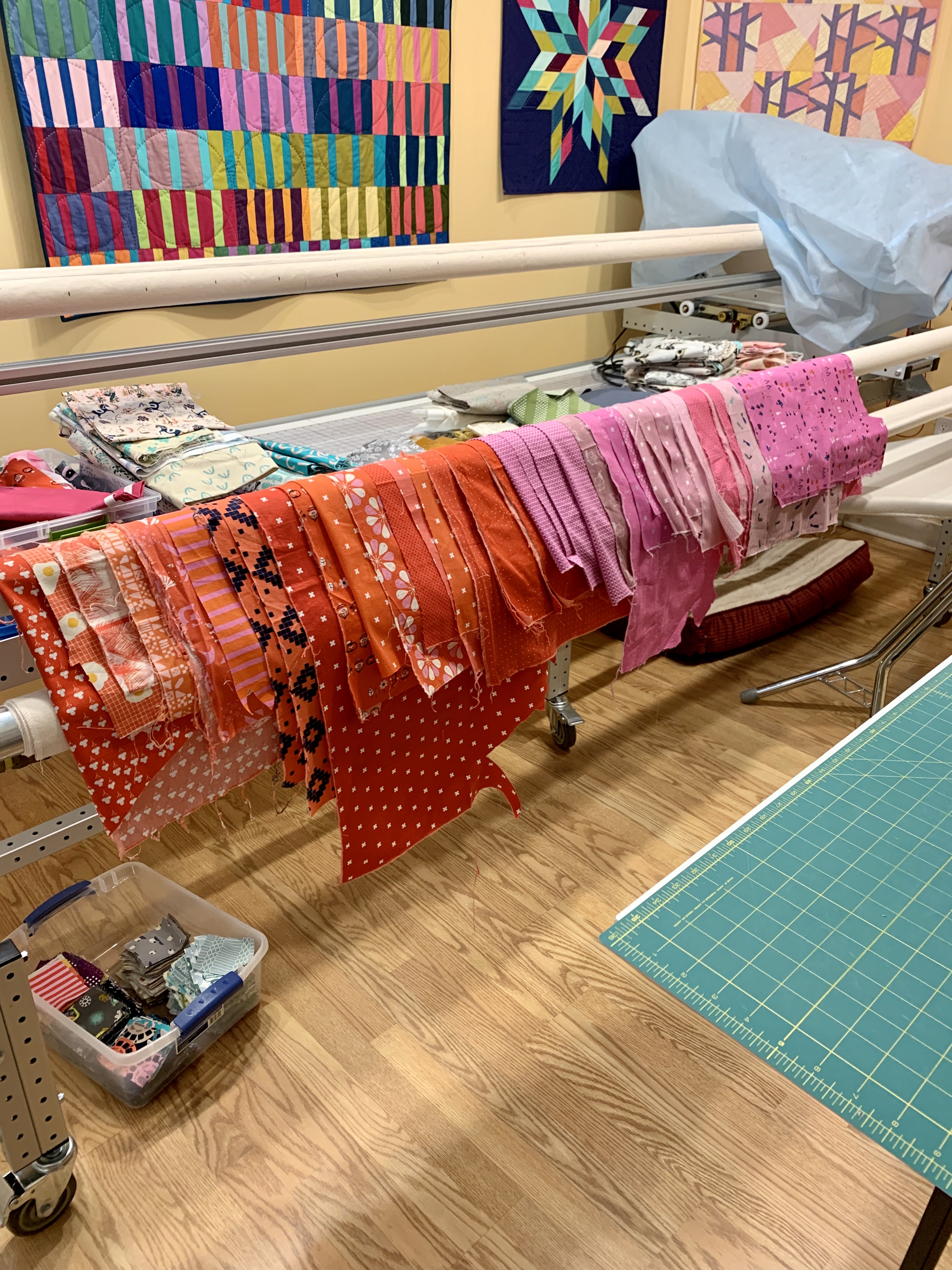 The long-arm holds ironed Cotton+Steel fabrics in pink and red. They are the docket for cutting up.