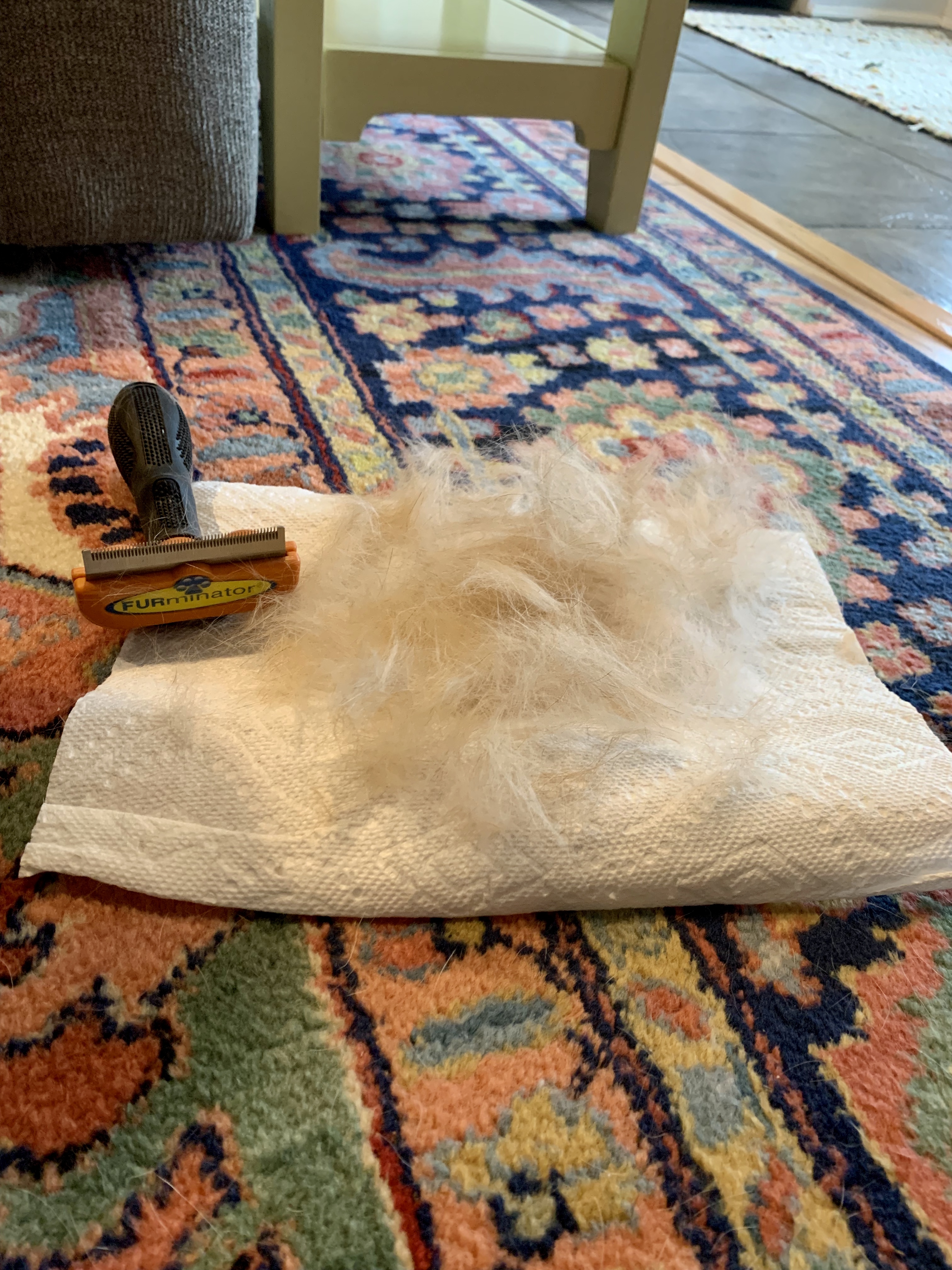 Good Heavens! I had to get out the vacuum to clean up the rug and me when I was done. The Furminator excels in getting out the loose undercoat in a dog. For AC, I got the short-hair medium-size dog version—and I highly recommend this tool as it has made a big difference in the amount of dog hair in my house.