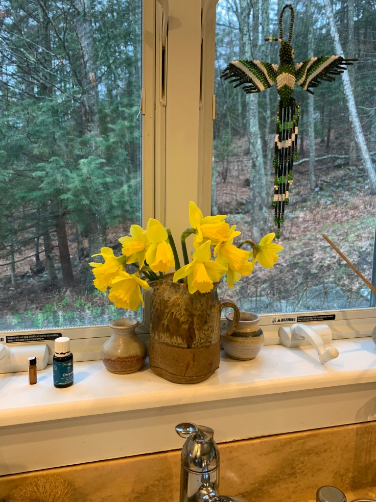 My daffodils are up and some are blooming. I picked this bunch Tuesday in the pouring rain after running an errand. They are still beautiful and fresh today, Friday. And I have so many daffs that I will have flowers in the kitchen for some time now.