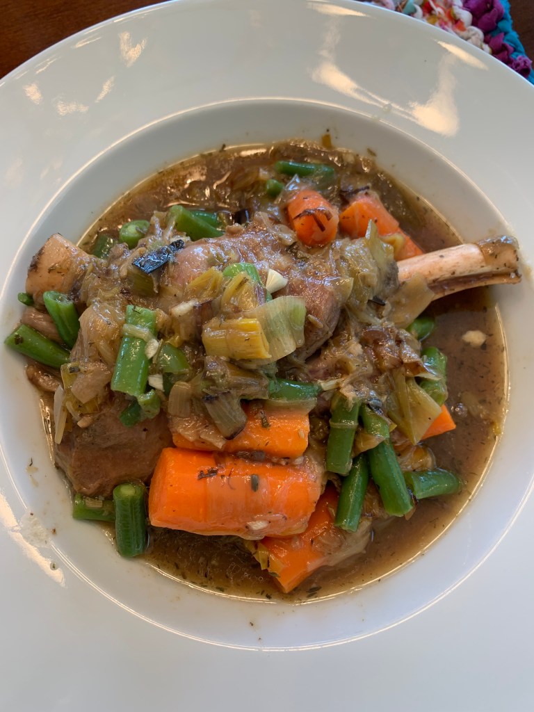 I cooked the carrots separately, drained them, and added them to a bowl big enough to hold the whole recipe when ready to be combined. I added the garlicky green beans (see earlier posts) I had on hand to the carrots while the lamb and leeks cooked. I browned the shanks in the Instant Pot in beef tallow while the 2 large leeks, with some chopped garlic and salt, cooked in lamb fat in a pan on the stove—lamb fat saved from an earlier lamb dish. When the leeks were golden, I added some water that would pick up all the browned (not burned) goodness in the pan. When the shanks were brown, I added the leeks and garlic, about 3 cups of water, herbs (a dried Provence mixture that includes some rosemary and lavender), salt, and several tablespoons of sprouted brown rice flour to thicken (you could use flour), and cooked for 40 minutes. I let the pot sit for 15 minutes after the 40 minutes were up before releasing the steam. I always turn off the ”keep warm” button as there is no need for it.