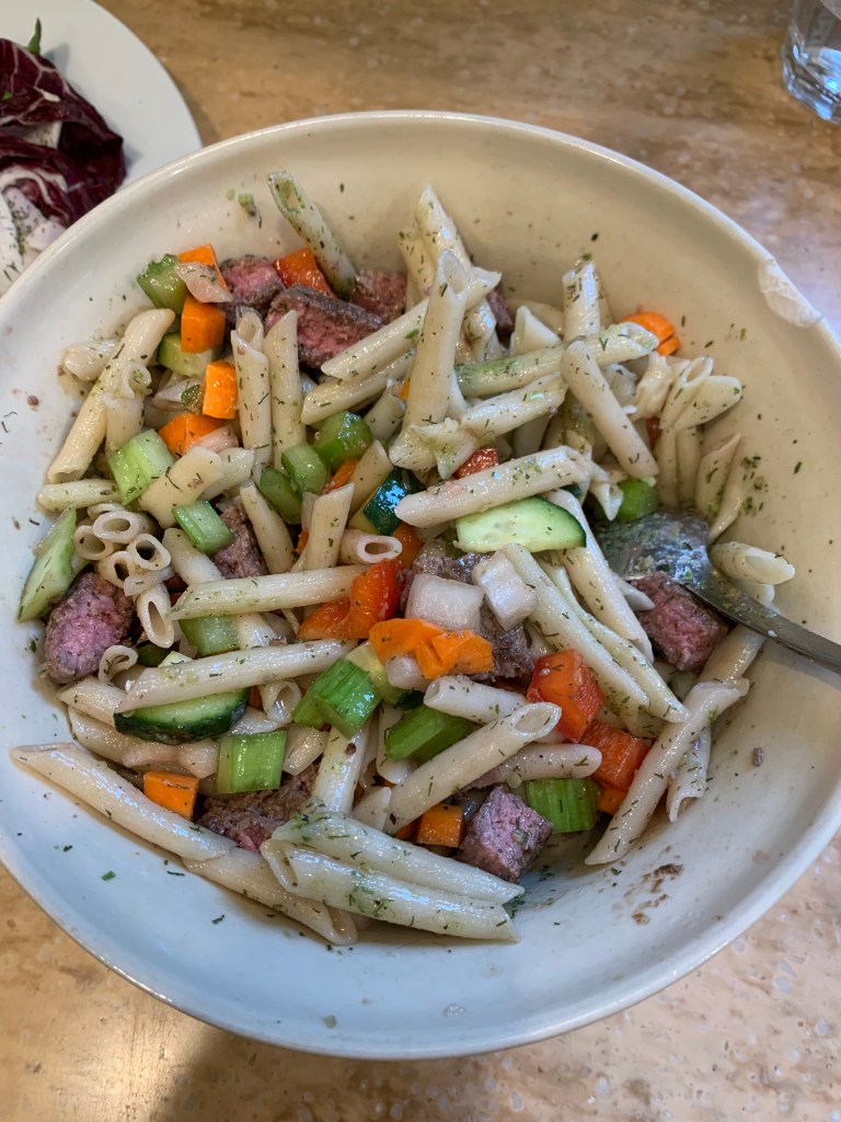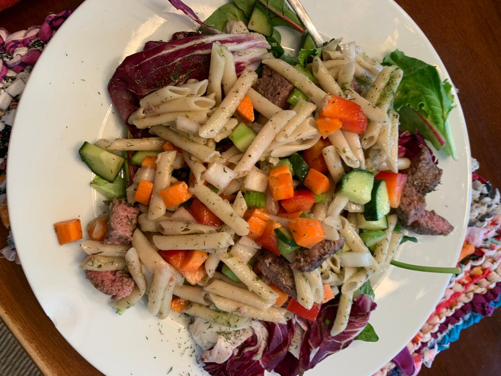 Some days before Betsy came, I got really hungry for a pasta salad. I have to use rice pasta, but I’ve gotten used to it over the years. It is softer and if overcooked can get gummy. I love to use crisp veggies in a pasta salad: celery, onions, carrots, colored peppers (red, orange, or yellow). I add some roasted meat, like chicken. And those tiny organic green peas that are in the freezer section. And lots of herbs—with good olive oil. Sometimes I add some grated mozzarella cheese.