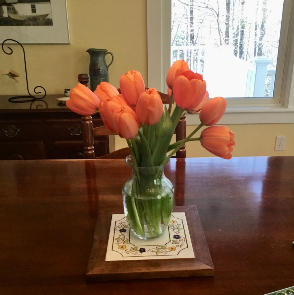 And—local peep—right up the hill from me is Golden Brook Flower Farm where the greenhouses are full of gorgeous flowers. This sweet bunch of tulips came to my house Wednesday and are also still just gorgeous today. Look at that beautiful tulip color. They came with very long stems, too, so I could have used a tall vase for them if I had wanted to.
