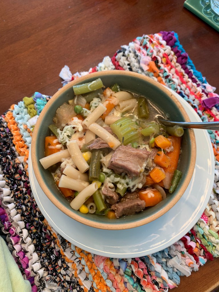 If you add pasta to a big pot of soup, it cooks ”out” pretty fast—in that it dissolves into the broth—as you reheat the soup—which means you lose the ”al dente” of the pasta. Here I used a bit of rice pasta macaroni—as that is what I had on hand that also needed to be used.