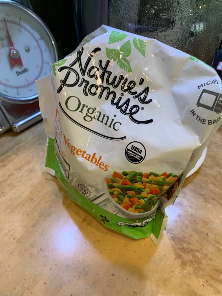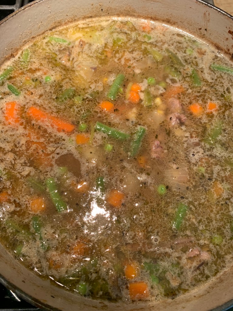At this point, I add in the leftover gravy, more water to make the ”soup,” and a package of frozen mixed veggies I had in the freezer.