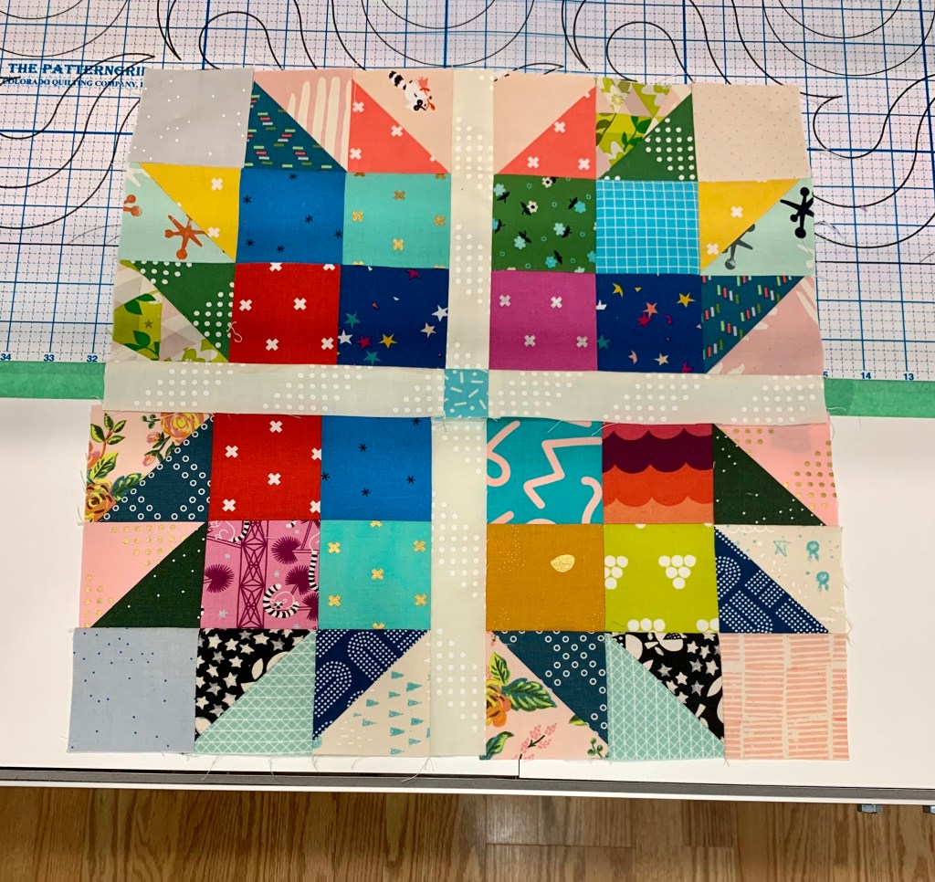 And I’m thinking that I can take the off-cuts from the 3-inch strips and make a VERY scrappy Bear Paws block that finishes at 16 inches square. Here’s my trial block—which I will take apart to spread out the color. I think it will work. The side sashings are a bit wider than the block sashings—so I’m not sure I’ll have enough of that cream Cotton+Steel Dottie fabric. No worries. I’ll just make the sashings scrappy. And, horrors, I may have to use some non C+S neutrals!!