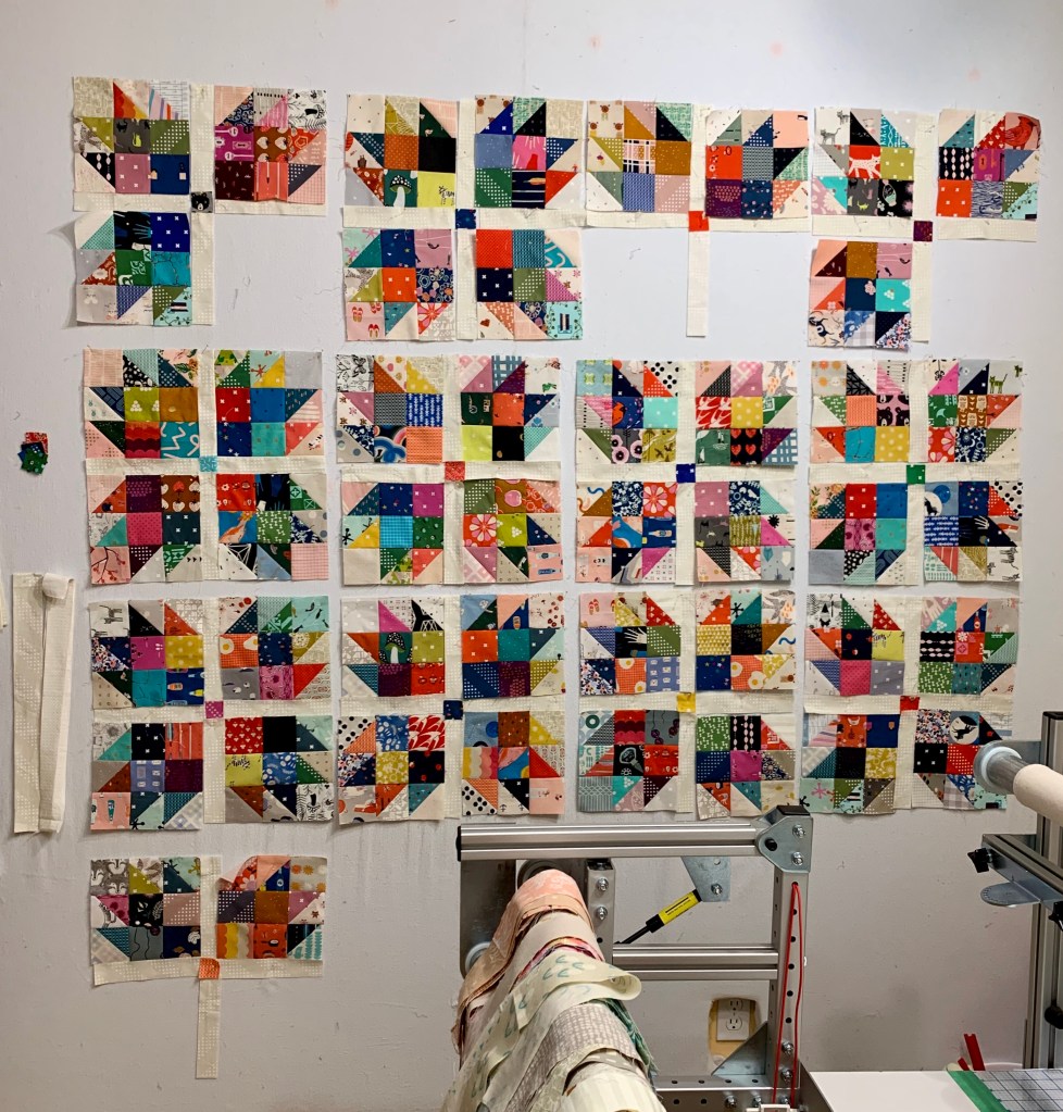 The Bear Paw quilt top is growing on the design wall—it’s being made from the last of the 3-inch Cotton+Steel strips I cut for the Churn Dash quilt tops. Each block will be separated by cream 2-inch strips and attendant cornerstones. I have not decided about the edges yet—if I take the 2-inch strips around the edge it will be because I have enough of that fabric.