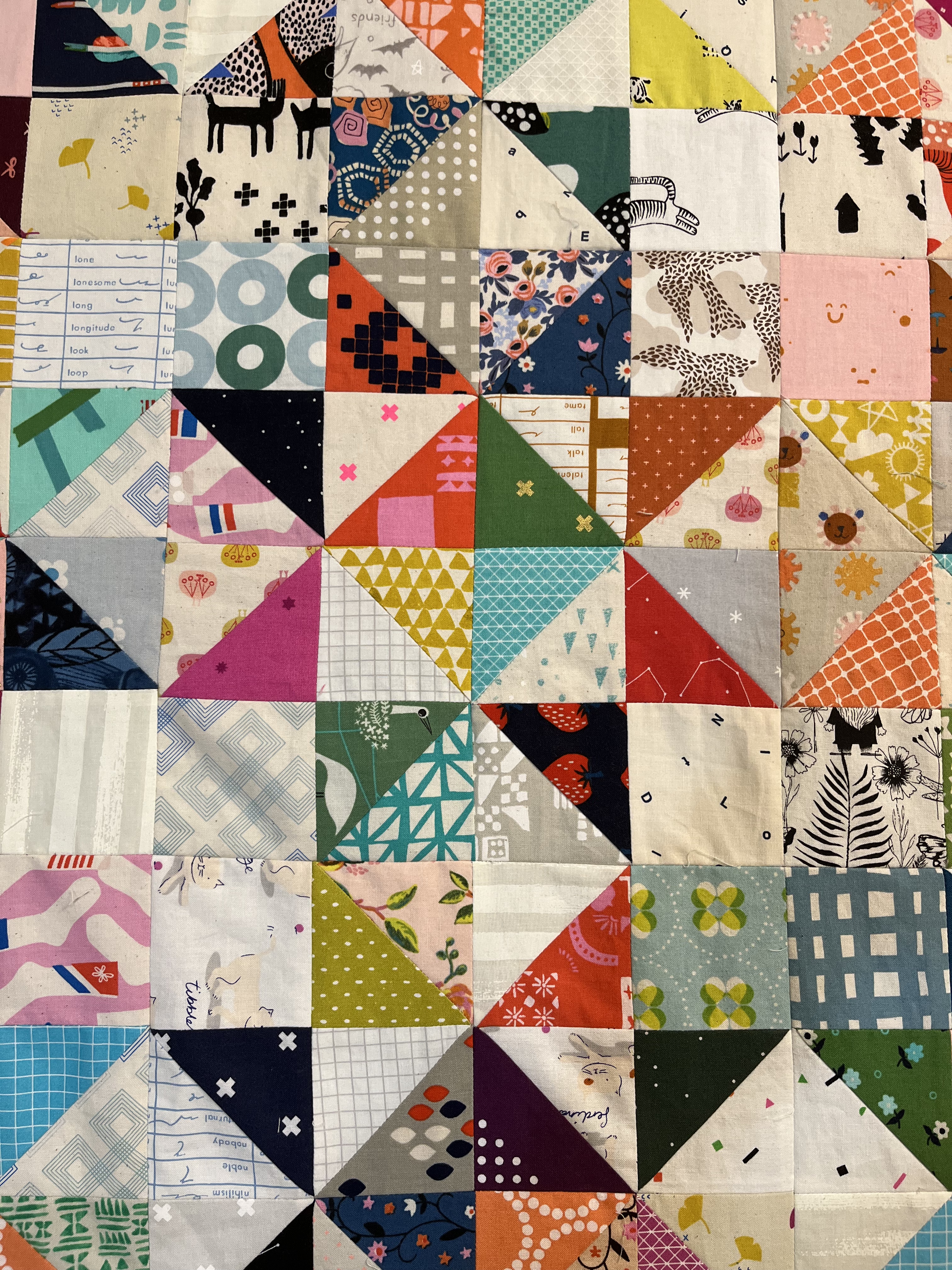 It’s busy, so the dark border contains/stops the business. I think it will need a light binding, and I have enough of one more bigger fabric to use for binding that is a sort of tan neutral.