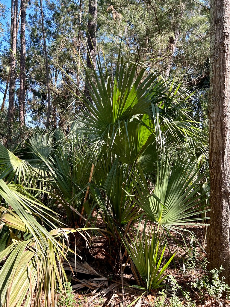 The saw palmetto is a prominent understory shrub in these low country woods and can form dense thickets in oak and pine forests. It provides protection and food for forest creatures, is very hardy, and can grow very tall if not cut back.