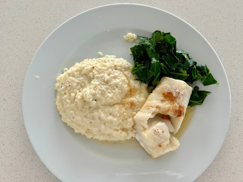 I was hungry when I got home and made my local, stone-ground low country grits, sautéed my collards in raw butter, and baked a cod fillet.