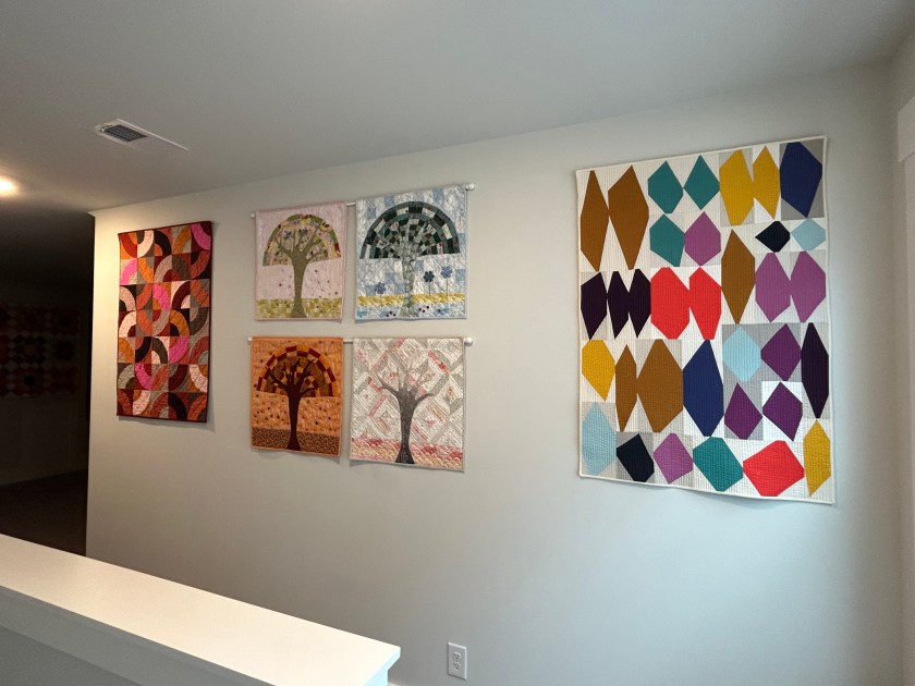 I measured from the ceiling down to line up the quilts below. And for the 4-season trees, I used matching white rods–and when the top two were hung on their rod, I used my long leveler (about 3 feet) to place the vertical placement of the lower rod so it was in line with the top rod and its nails.