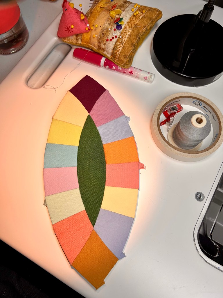 When I have the outer rings sewn, I can overlay them on the center piece and use the tape to hold everything firm. (The tape can be reused–and when I’m done for the moment, I put pieces back on the tape ring so they don’t dry out.) When sewing the rings, I also use a small piece of the tape to hold the inner curved top pieces firmly while I sew them. The pieces in the middle are easy to sew with the standard method of putting right sides together and whip stitching them.