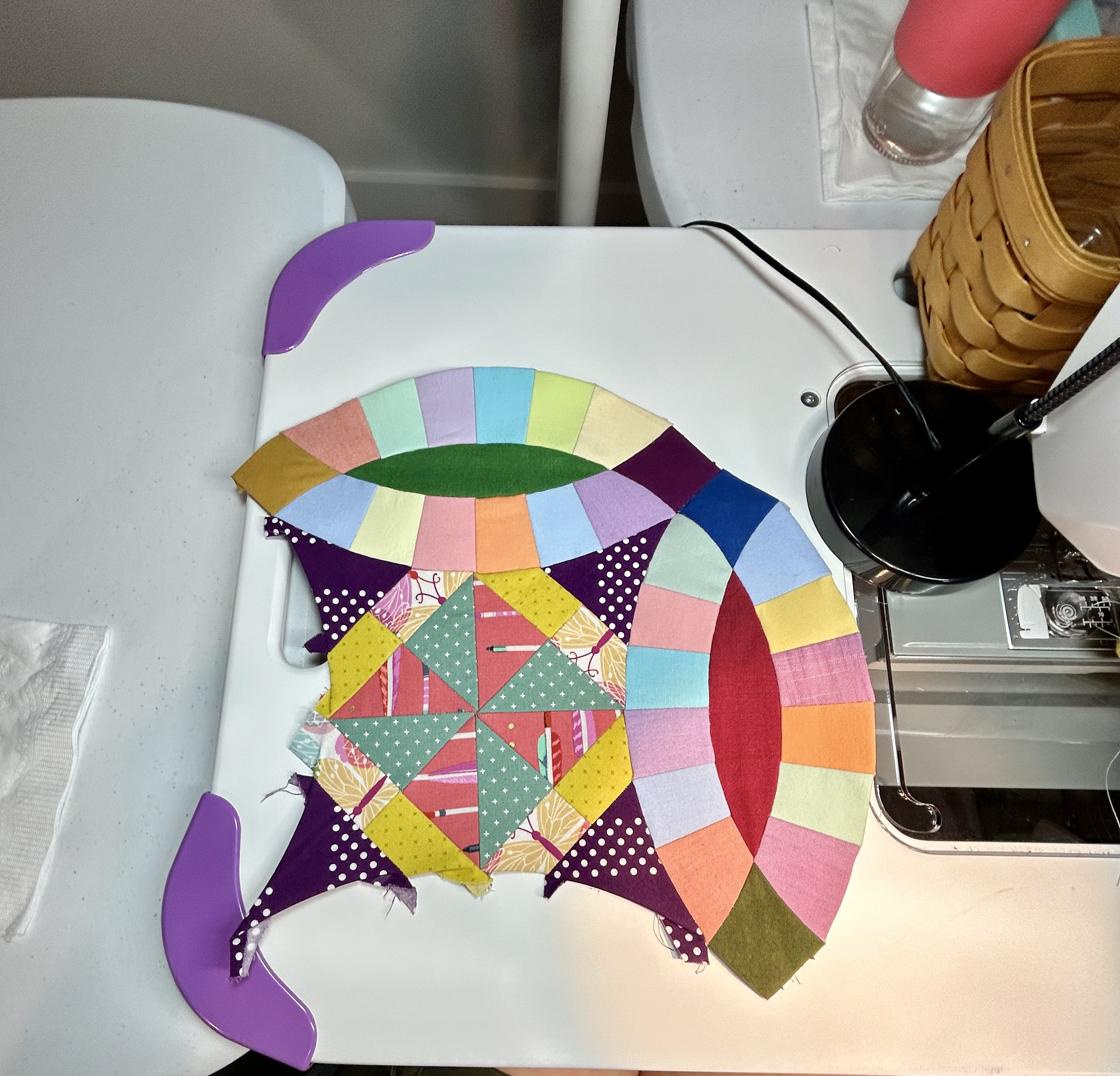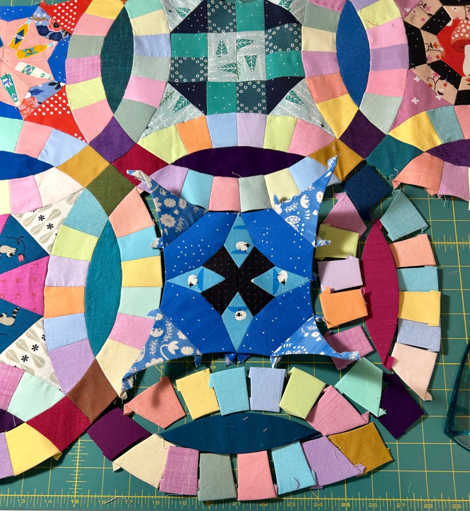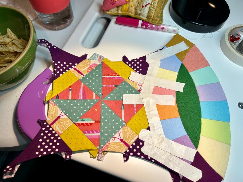 One reason I have hated this EPP project is that the curved rings are so very hard to attach. I finally saw Tara Faughnan, in one of The Color Collective classes, hosted by Sewtopia, use artist tape, installed on the front of the block, to hold pieces in place while they are being stitched. With the tape, I can keep the rings lined up without losing how they should fit properly into the bigger block. Basically, one runs into the same problems with these curves that one has with sewing any curves together–seemingly excess fabric that falls into place if both sides are laid flat.