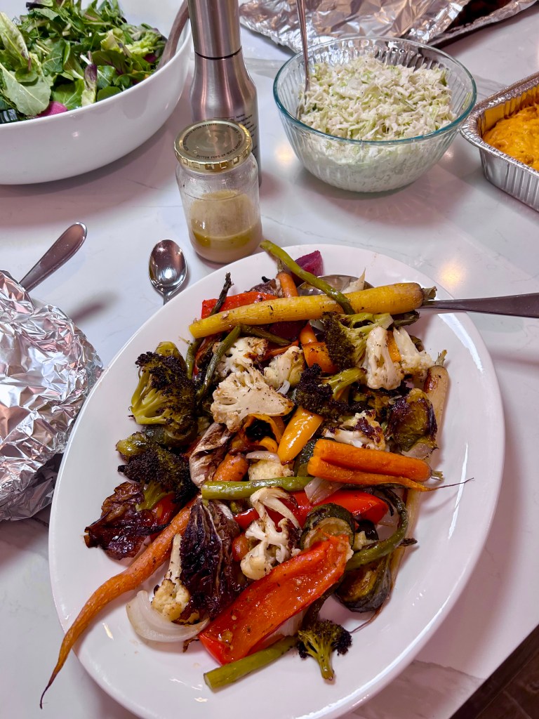 Saturday night at Mike and Tami’s, 14 people sat down for dinner: 4 adults (two grandmothers and 2 parents) and the rest ranged from 15 years to college freshmen. It was so fun to be amongst this energetic and happy crowd. M&T had BBQ with all the fixings, and Mike had also made extra side dishes, to include two platters of roasted veggies and a big salad.