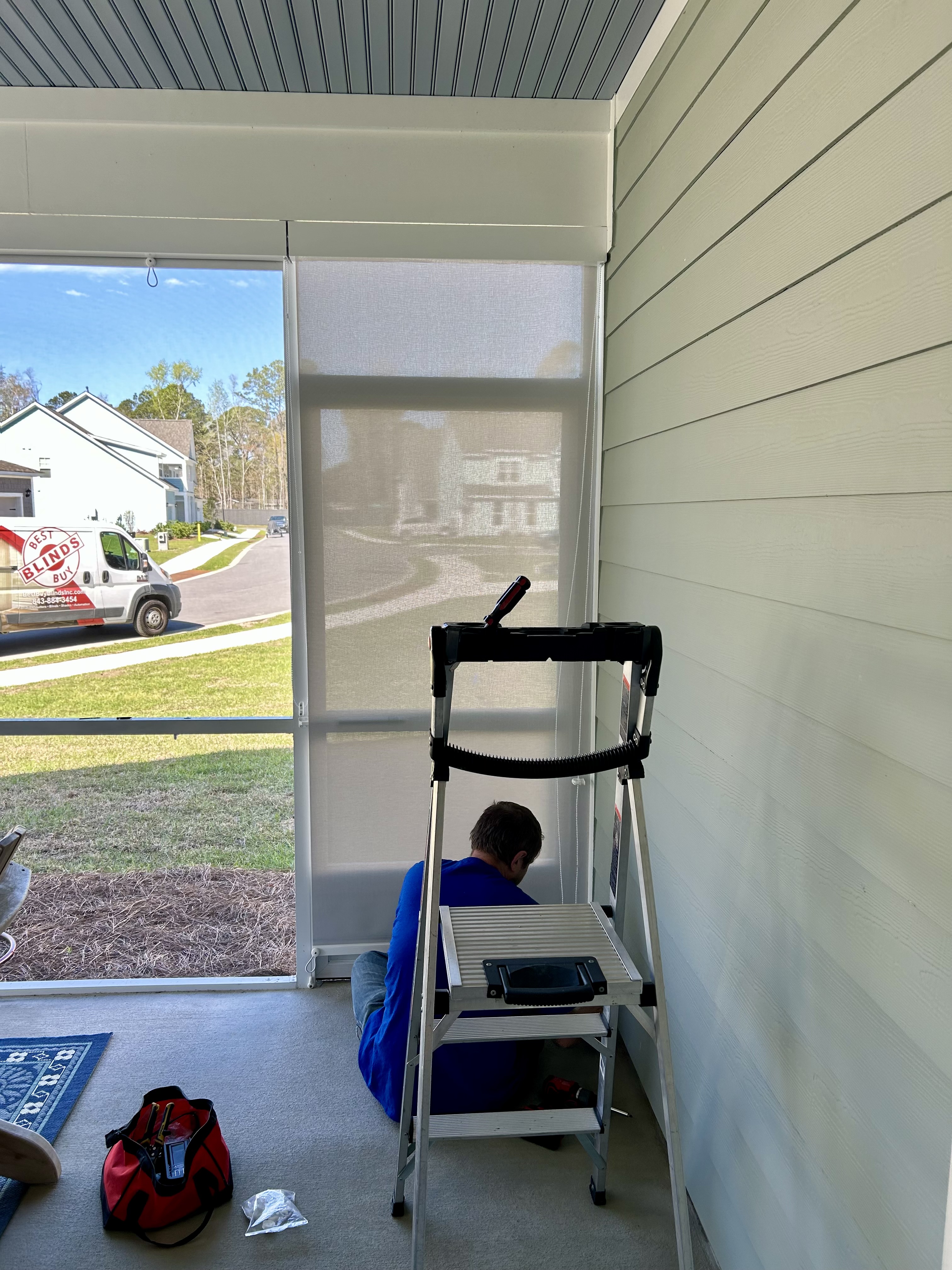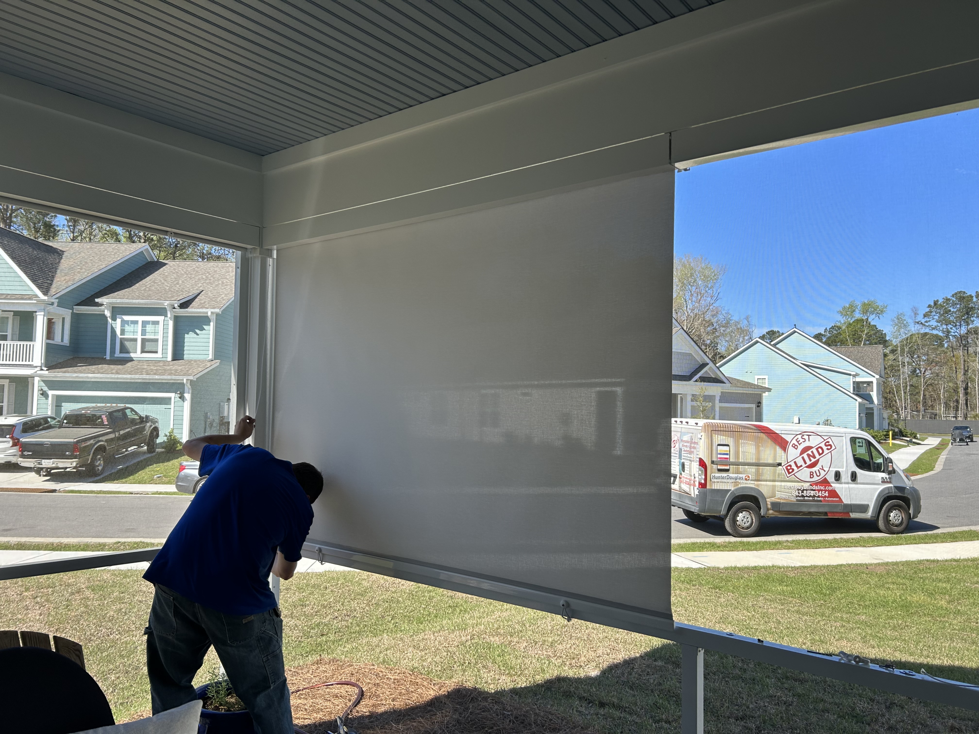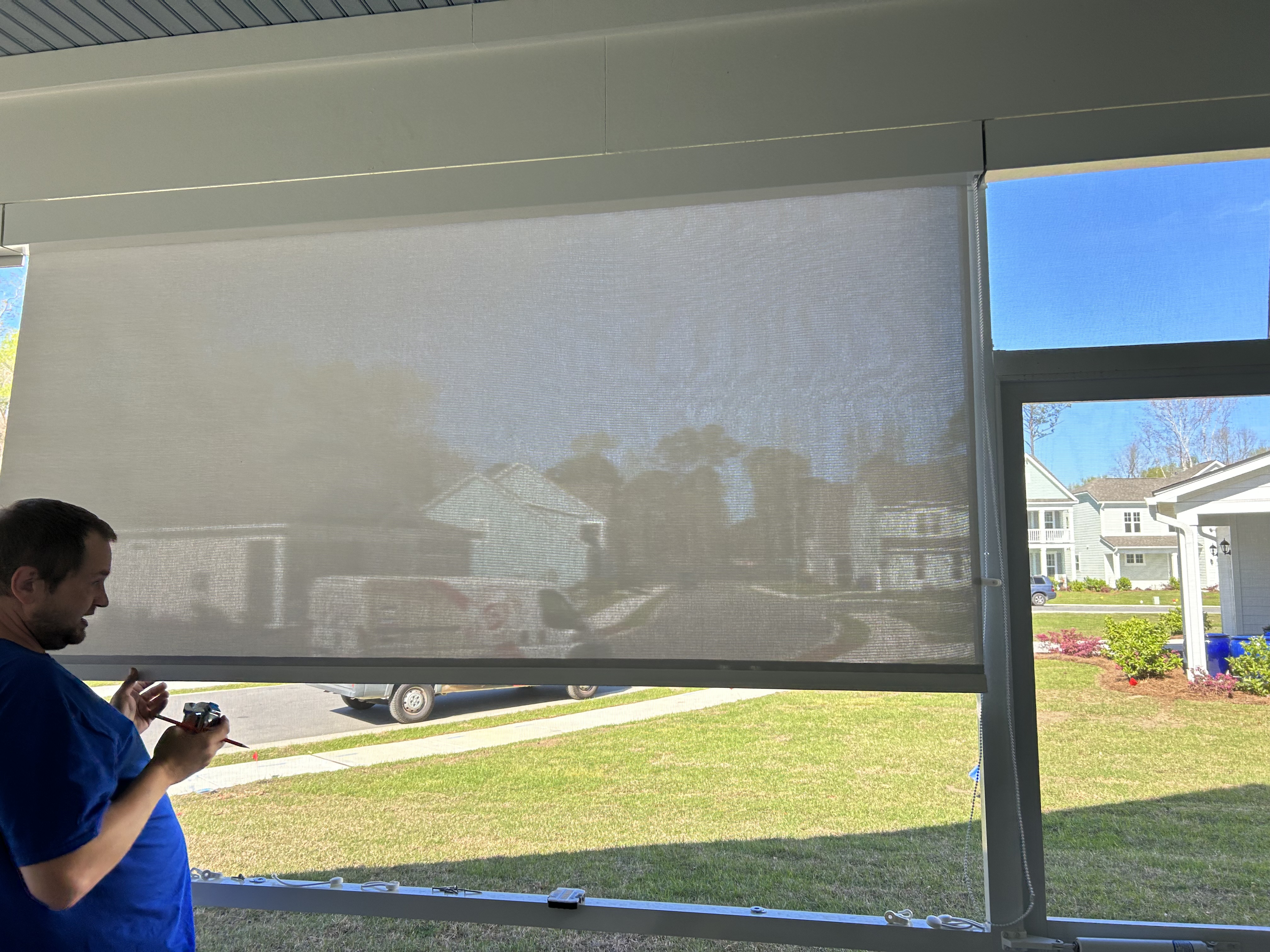 The shades are perfect. They were installed yesterday, and you can see that they mask the outside and will prevent direct sun on the porch, but will allow light and vision. The porch can be made cooler and more private without losing the sweeping views I have.