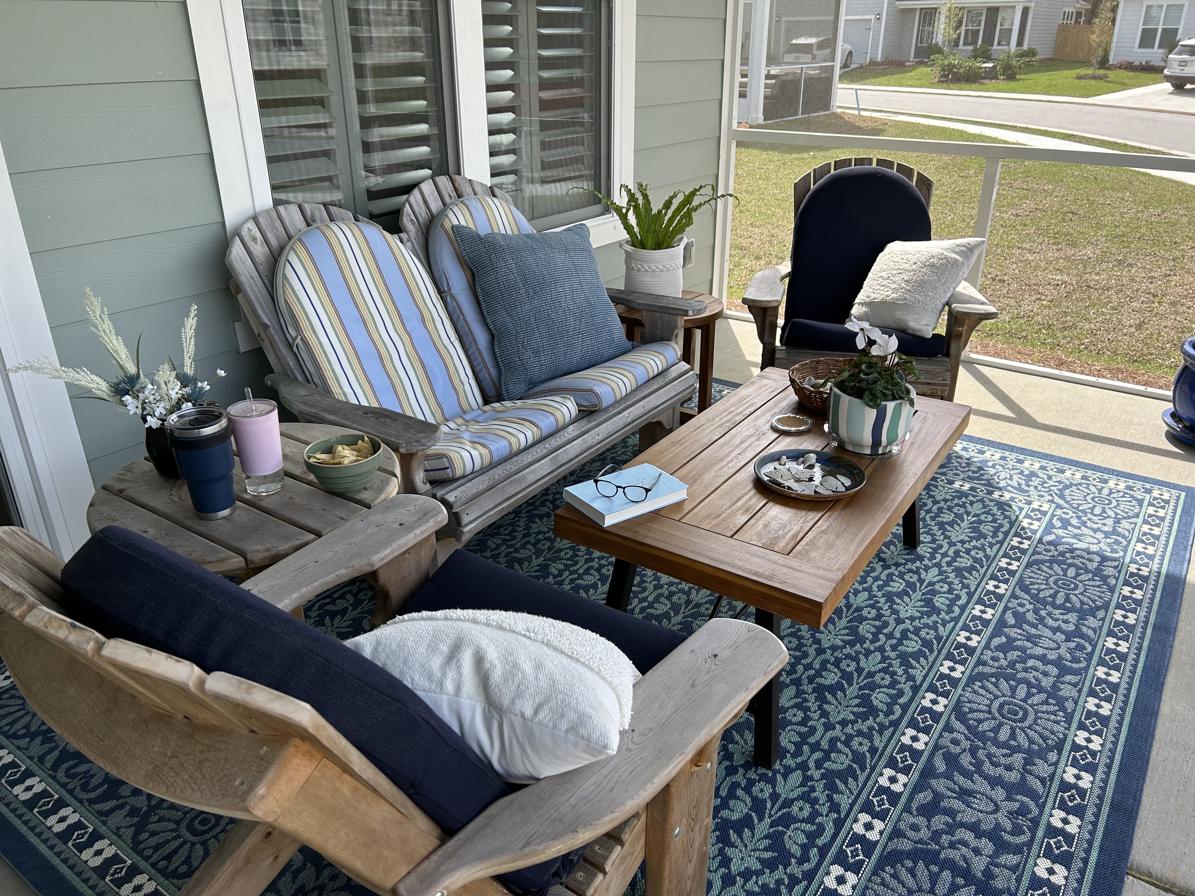 “You might like an outdoor rug on that screened porch,” DIL Tami said. “You might like to make an outdoor room to enjoy most of the year.” And realtor/friend Lisa Hartley said “I found an outdoor rug at Target a few years back that is wearing outside beautifully. We just hosed it off this spring and it looks like new.”