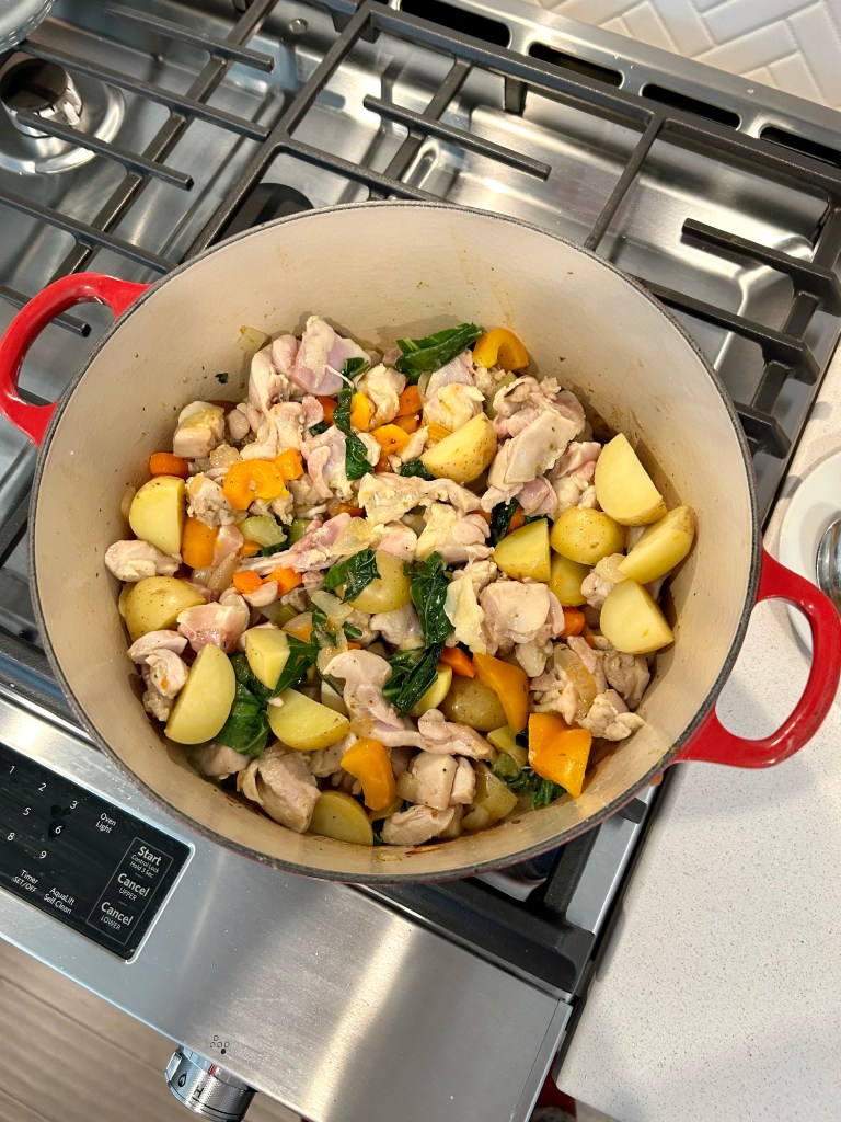 Here’s the base–onions, garlic, carrots, orange bell pepper, a few COLLARD leaves chopped up, some little round potatoes quartered, dried herbs, sea salt, and two packages of boneless chicken thighs with the skin on as the best nutrients and fats are just under the skin. I sautéed the veggies in duck fat–only adding the fresh garlic after the veggies were started so it does not burn as it would if you just dump it into hot fat. I cooked the veggies, turning them often, until they started to color/caramelize, and then added the chicken to cool down the mixture so it didn’t burn. You can see the caramelization in the bottom of the pan–don’t let things burn at the point before you add your raw meat. *Note that it is this caramelization step that makes a soup have rich robust flavor and a beautiful color.