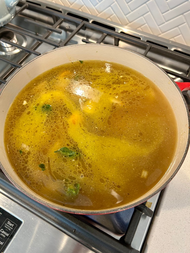 On Tuesday, to prepare, I made a bone broth from the chicken bones and organs I had frozen in recent weeks–with added onion, carrots, celery, and garlic. I think now that bay leaf might also have been involved. If an onion is free of any mold, I add the peels as well as the skins add lovely color. On Wednesday, I made a soup so I would have soft, nourishing food on Thursday after the morning appointment.